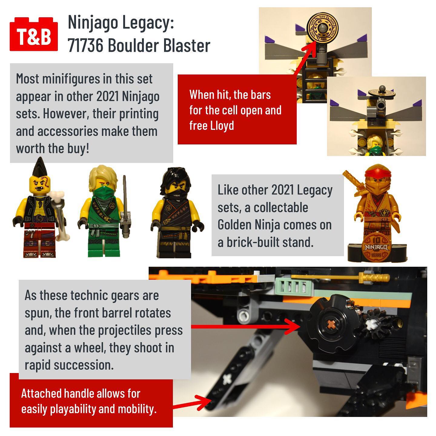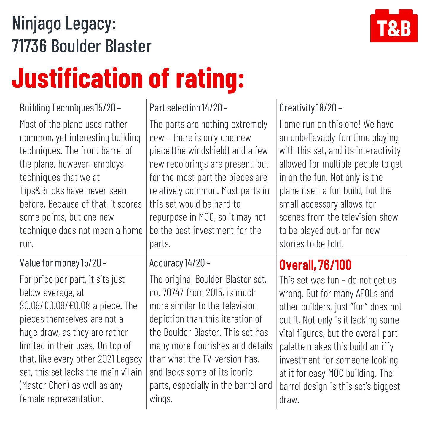 Overall, 71736 Boulder Blaster is a very fun with a great design for the barrel. The other parts of the set are less desriable though; it lacks some vital figures from the Ninjago season and the overall part palette is either love or hate.