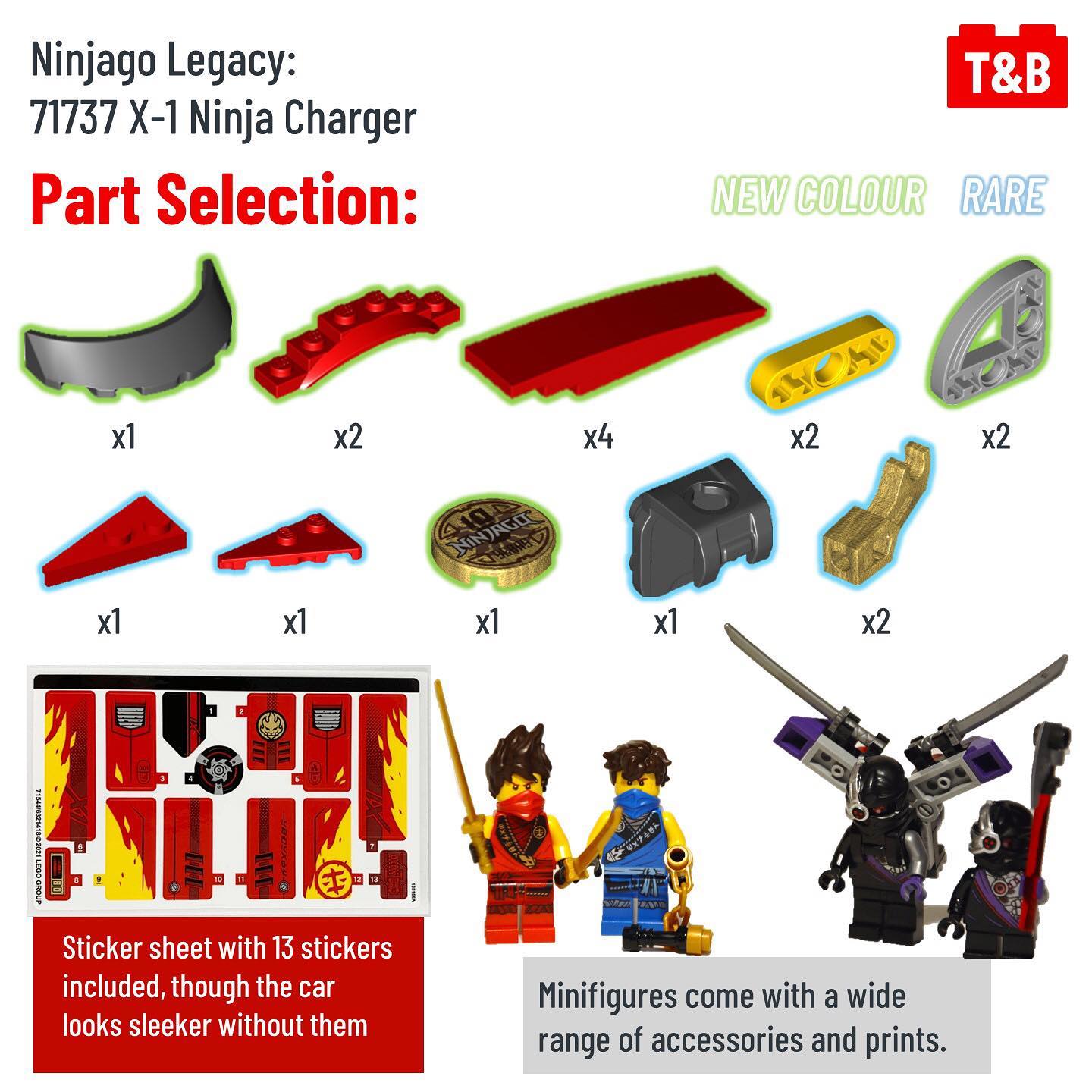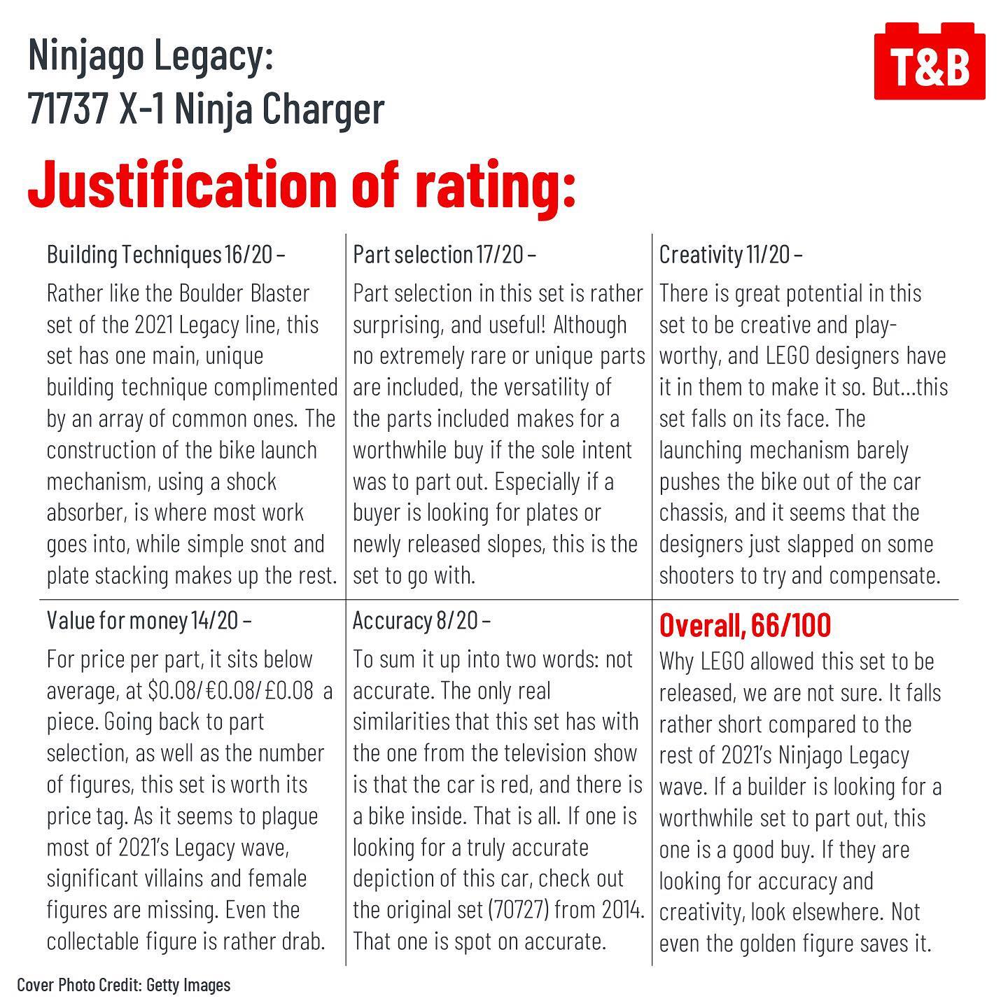 Again, 71737 X-1 Ninja Charger has some fun features, but we the mechanism for releasing the bike from the car doesn’t work well for us and we’ve heard many others say the same. It’s not accurate to the show and while still looks sleek, for a Legacy set it should be more accurate than the previous set, not less. It also lacks some vital figures but does feature some good parts such as the newer slopes.