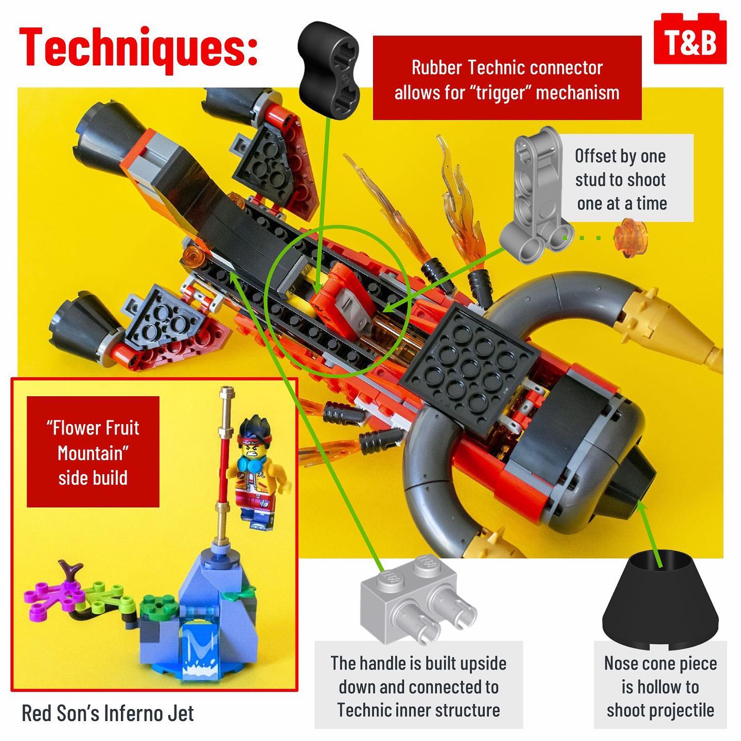 The Inferno Jet is very much more geared to be play set rather than a display set like the Legendary Flower Fruit Mountain (see our post #1275 for our review on that set!). It has a play feature of shooting projectiles out of the nose, using clever techniques to provide access to reload. The minifigures are underwhelming though, with none of them being new.
