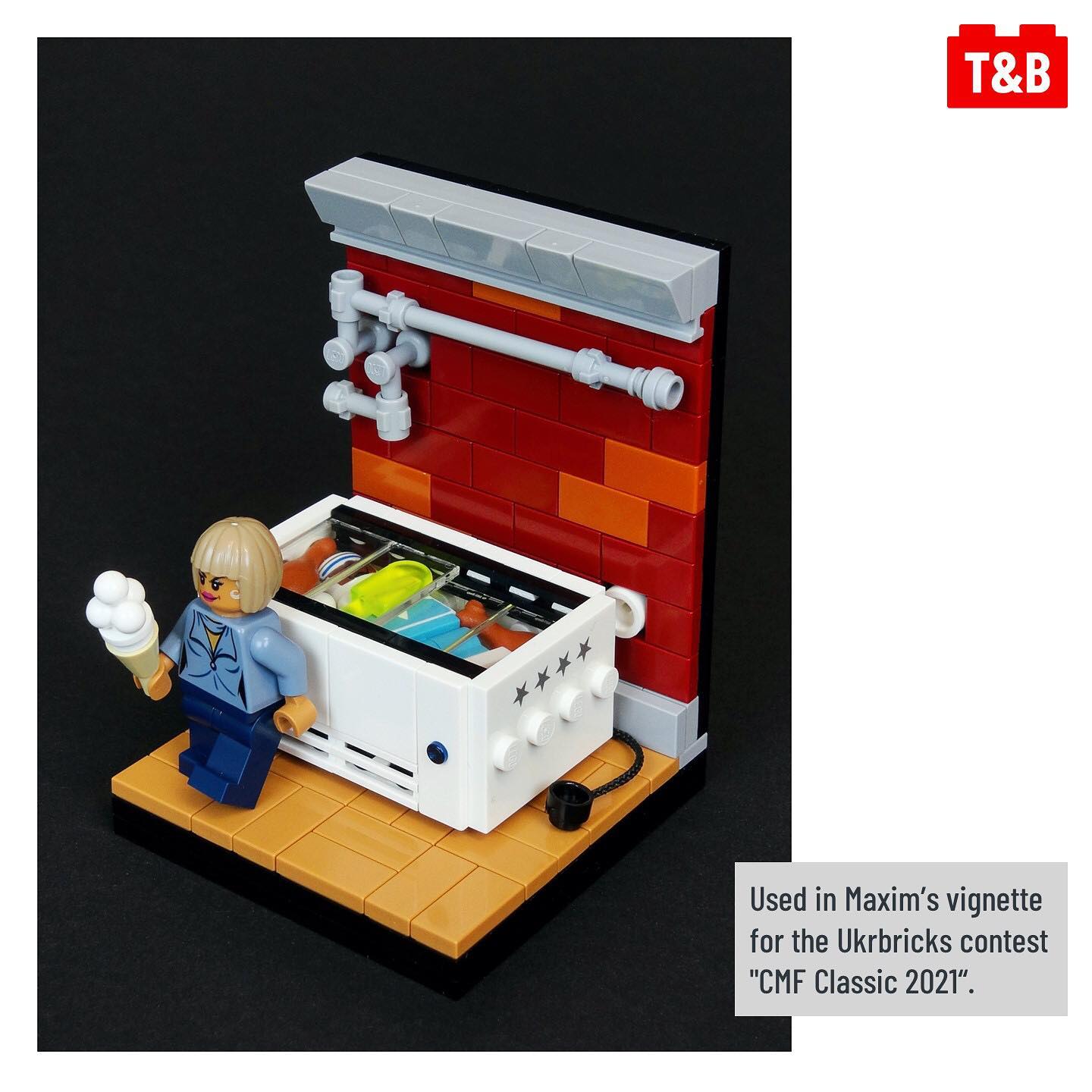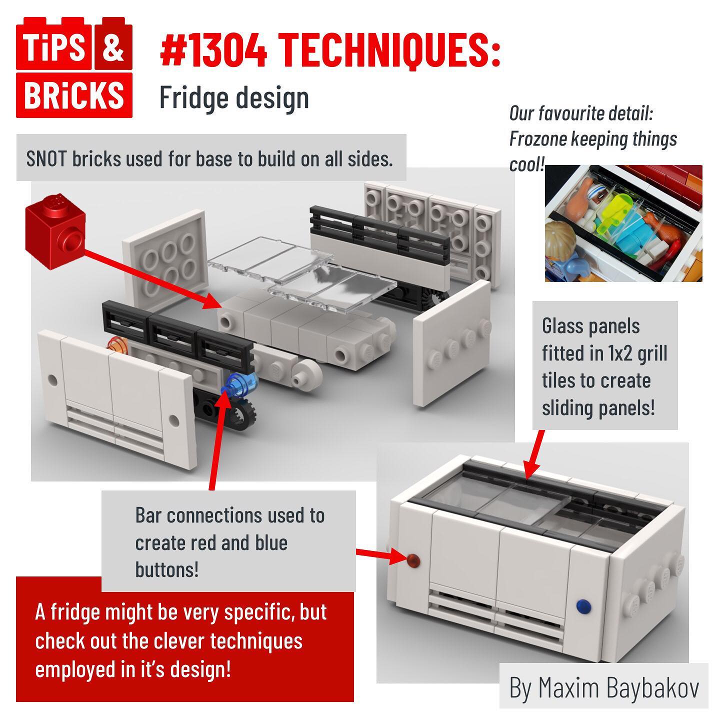 Today we’re sharing a very specific design of a fridge, but one that employs some very clever techniques! The builder Maxim Baybakov utilises bar connections to create red and blue buttons, as well as glass panels fitted in 1×2 grill tiles to create sliding panels! The whole design is built around a base of SNOT (Studs Not On Top) bricks so that he can build on all sides. But our favourite detail of the whole build: Frozone keeping things cool!
