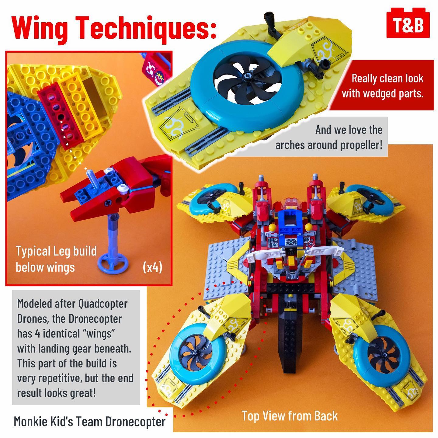 Finally, we have the 80023: Monkie Kid’s Team Dronecopter – this is an expensive set but you get what you pay, especially with the 10 figures, but also with the elaborate play feature of swivelling the dronecopter’s guns. We had very little to criticise about it, and especially loved the creativity to combine a drone and helicopter, as well as clever container builds