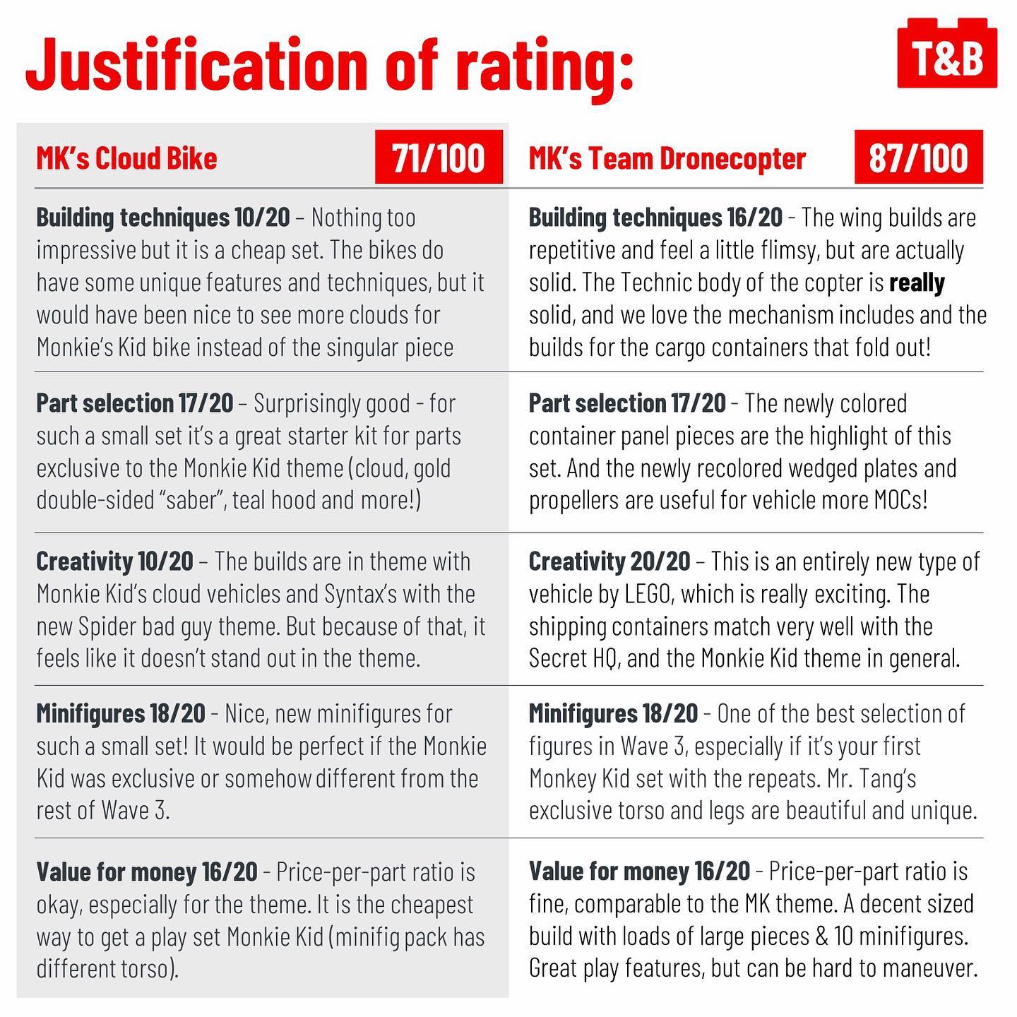 Today we’re sharing our final reviews of the 2021 Monkie Kid sets! We’ve really enjoyed bringing you these reviews and we’re ending things with a bang with 2 pretty great sets. We were sent these by LEGO but our view is unbiased and we aim to provide a unique review from the perspective of a MOC builder and fan of building techniques. We score sets out of 100, giving 20 points each for a variety of factors.