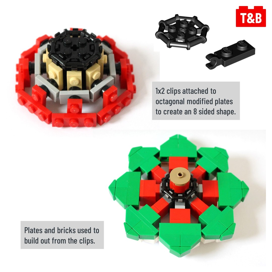That part is the octagonal modified plate, as you can attach clips to it’s eight sides then build off of them to create 8 sided shapes. To expand the technique to 16 side shapes, use two of the modified plates and offset them, allowing you to place more pieces.