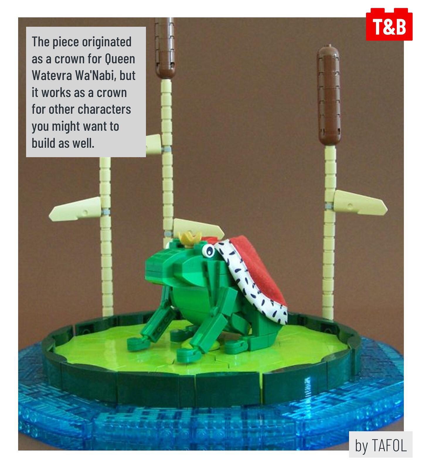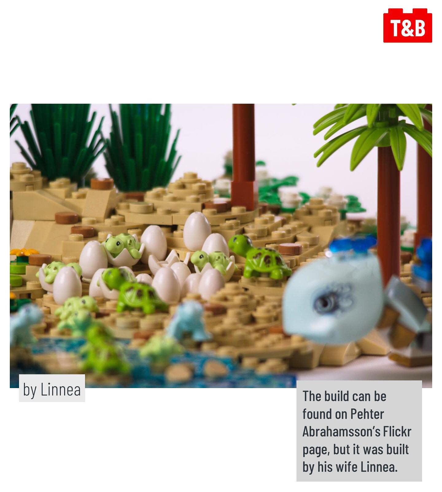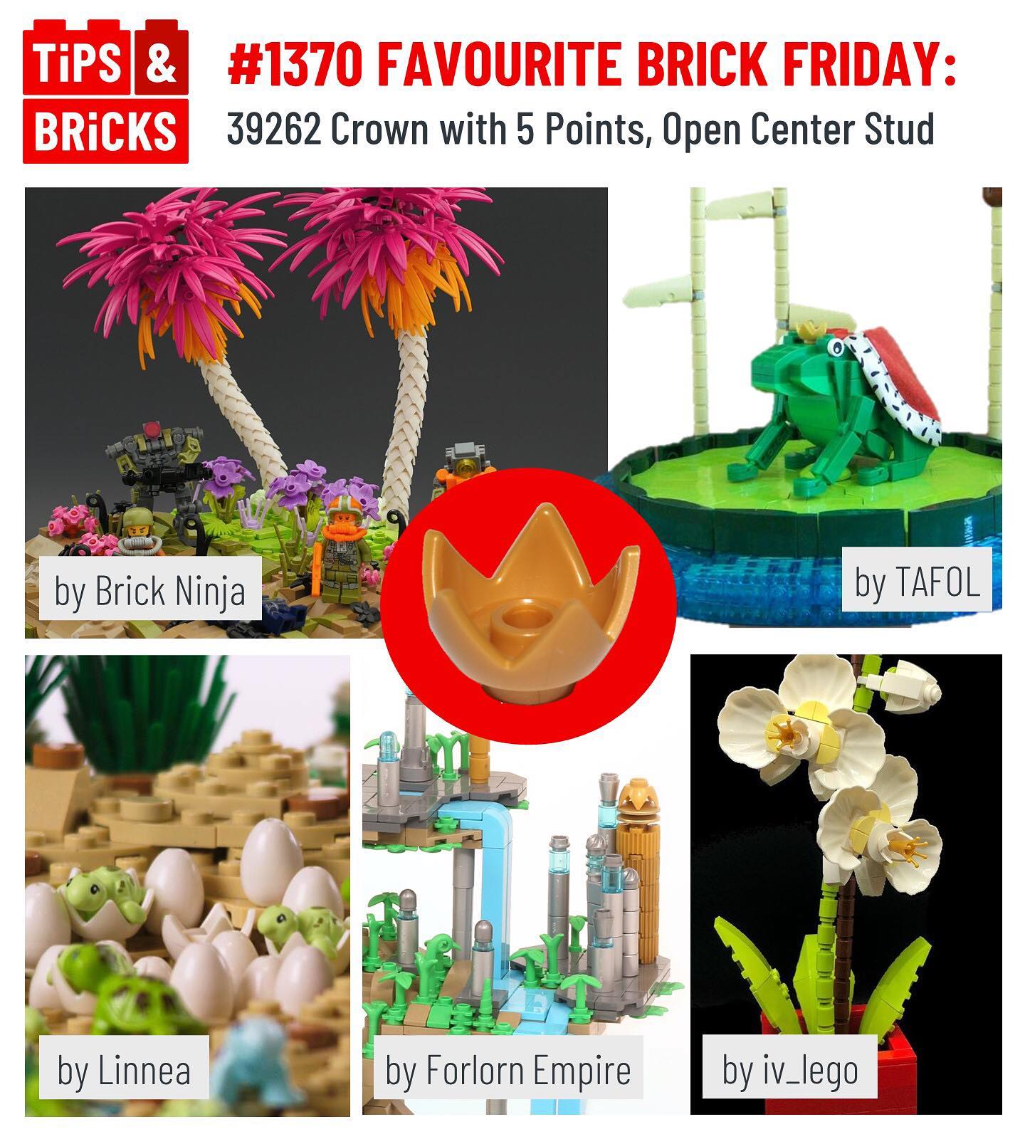 What do trees, crowns, flowers, buildings, and eggs all have in common? You can build them all, and more – using the crown with 5 points! This part was introduced as part of the Lego Movie 2’s Queen Watevra Wa’Nabi, but here, @brick.ninja uses lots of them to create textured tree trunks, and Linnea uses them to show hatching turtles (build available on Pehter Ambrahamsson’s Flickr page). Meanwhile, @forlornempire uses the piece to add detail to a microscale building, and @iv_lego uses it to build beautiful flowers! Finally, TAFOL on Flickr uses the crown as intended, adding a cute and quirky touch to a frog that is much bigger than the crown.