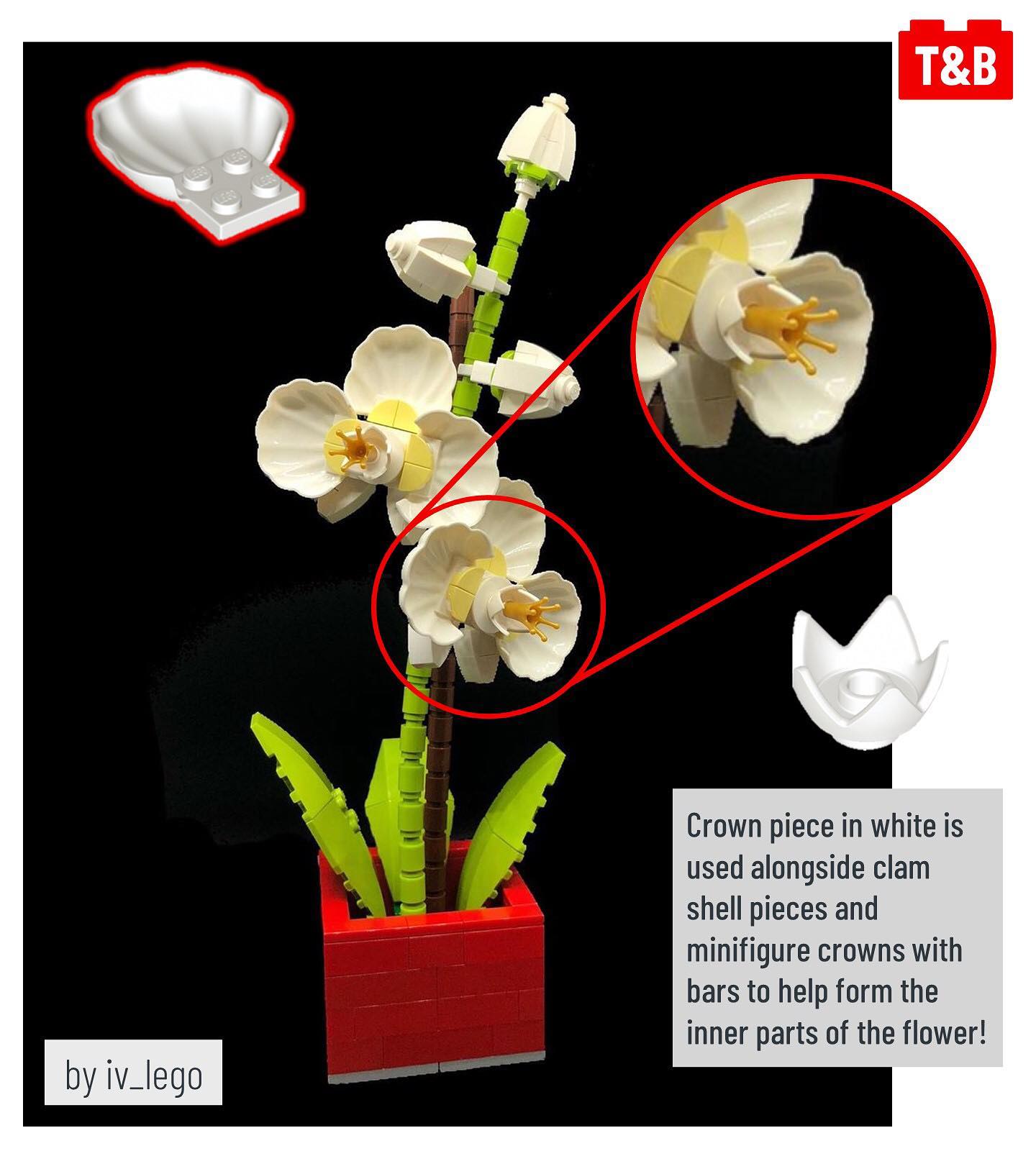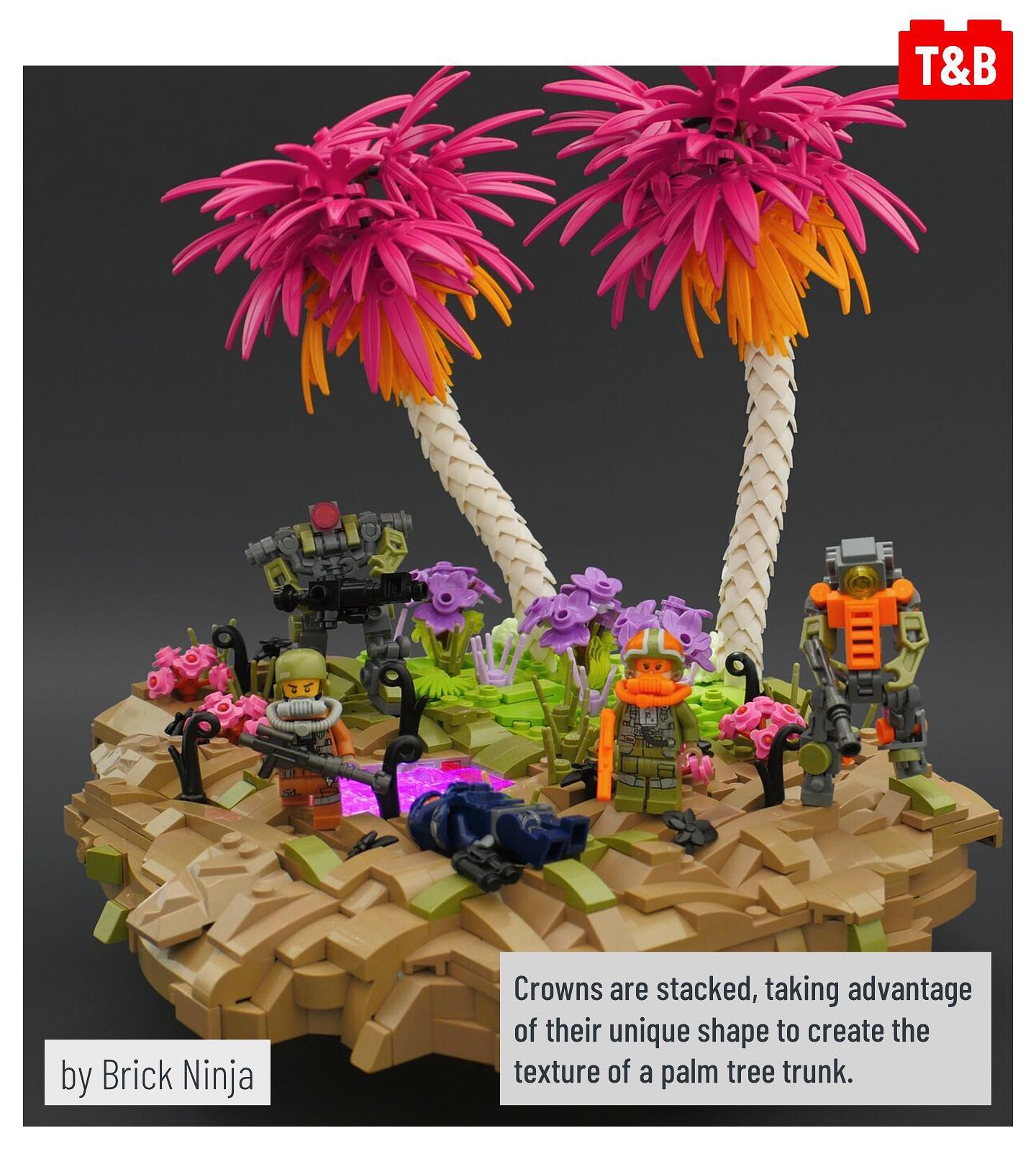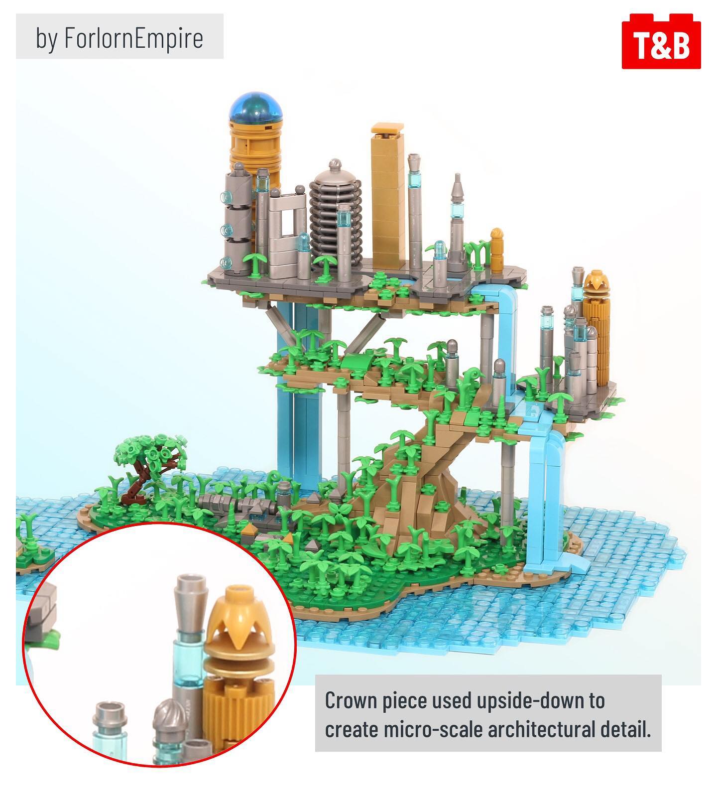 What do trees, crowns, flowers, buildings, and eggs all have in common? You can build them all, and more – using the crown with 5 points! This part was introduced as part of the Lego Movie 2’s Queen Watevra Wa’Nabi, but here, @brick.ninja uses lots of them to create textured tree trunks, and Linnea uses them to show hatching turtles (build available on Pehter Ambrahamsson’s Flickr page). Meanwhile, @forlornempire uses the piece to add detail to a microscale building, and @iv_lego uses it to build beautiful flowers! Finally, TAFOL on Flickr uses the crown as intended, adding a cute and quirky touch to a frog that is much bigger than the crown.