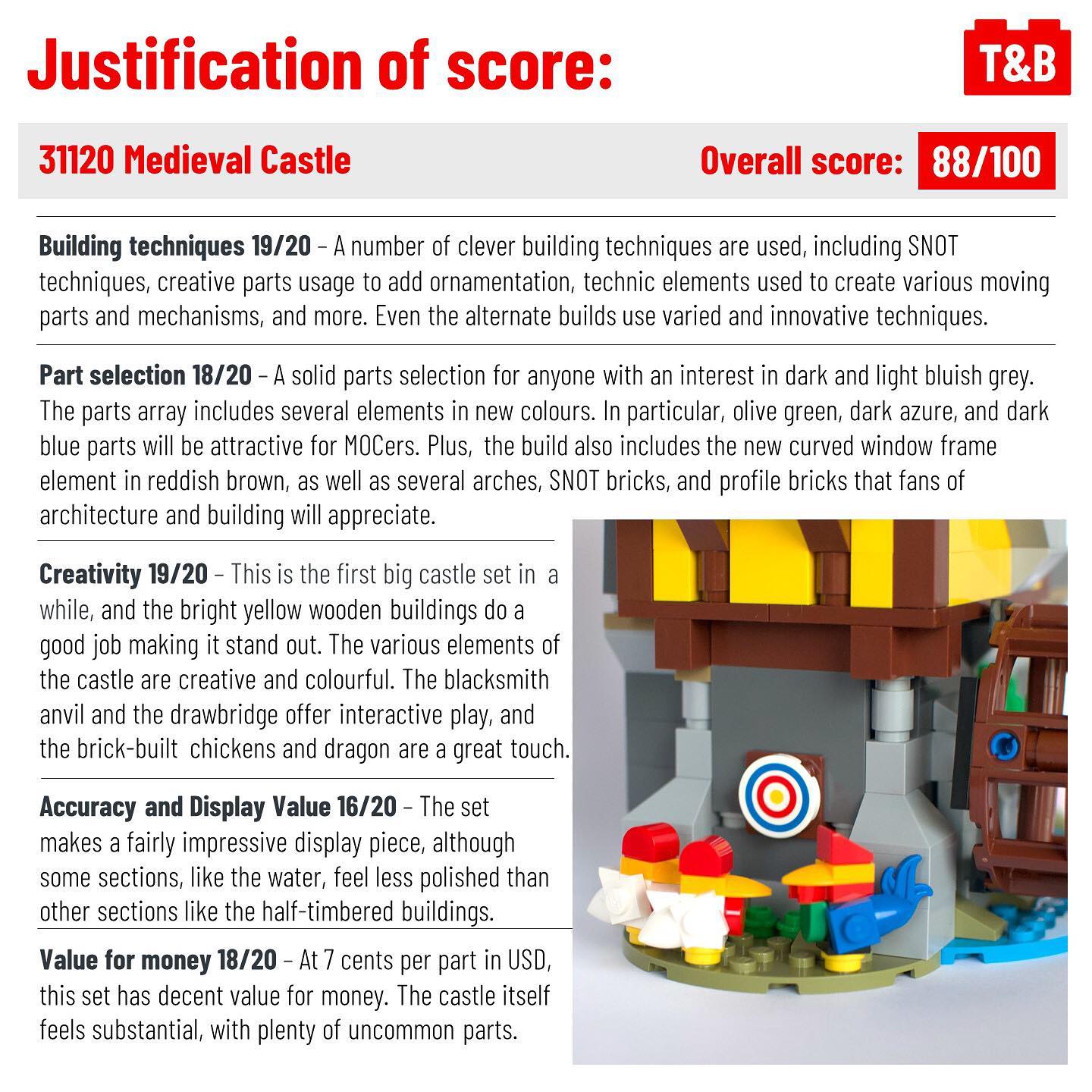 Hear ye, hear ye! The next Creator 3-in-1 review we have today is the magnificent Medieval Castle. We were sent this set by LEGO but our view is unbiased and we aim to provide a unique review from the perspective of a MOC builder and fan of building techniques. We scored this set out of 100, giving 20 points each for a variety of factors.