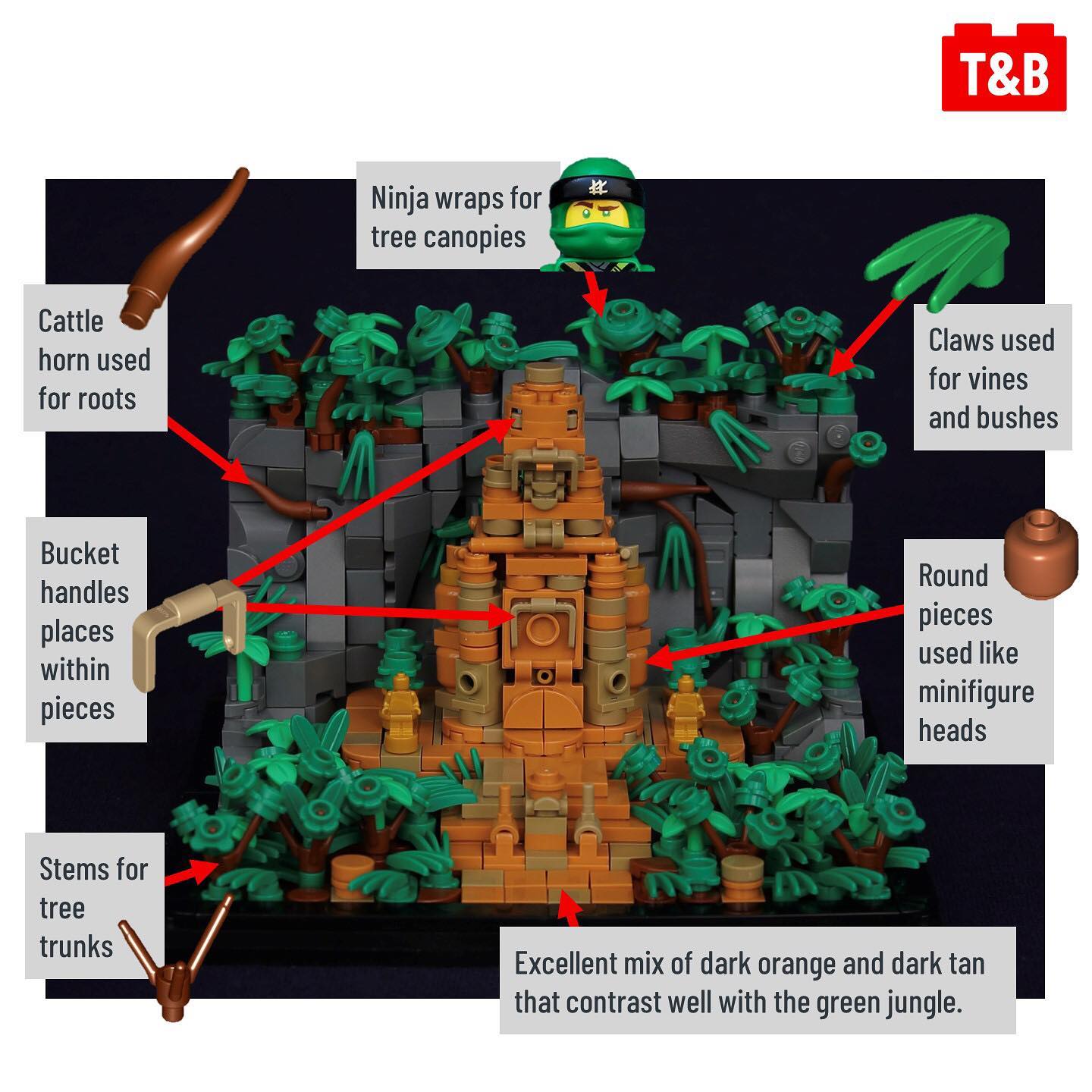 Today’s technique analysis is a build that’s fresh off of RebelLUG’s annual #vignweek Jungle Temple by Carter Witz! This build is an excellent example of how to do microscale builds right, showing you don’t need a lot of pieces to make a fantastic build. Our favourite techniques are the use of claws for vines and bushes as well as the build of the temple which contrasts perfectly to the lush green jungle.