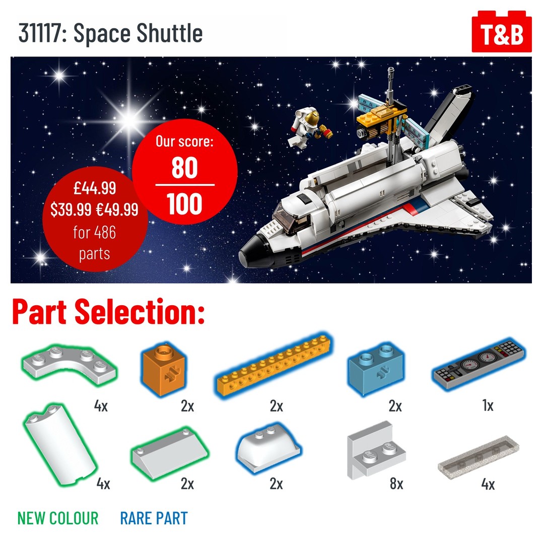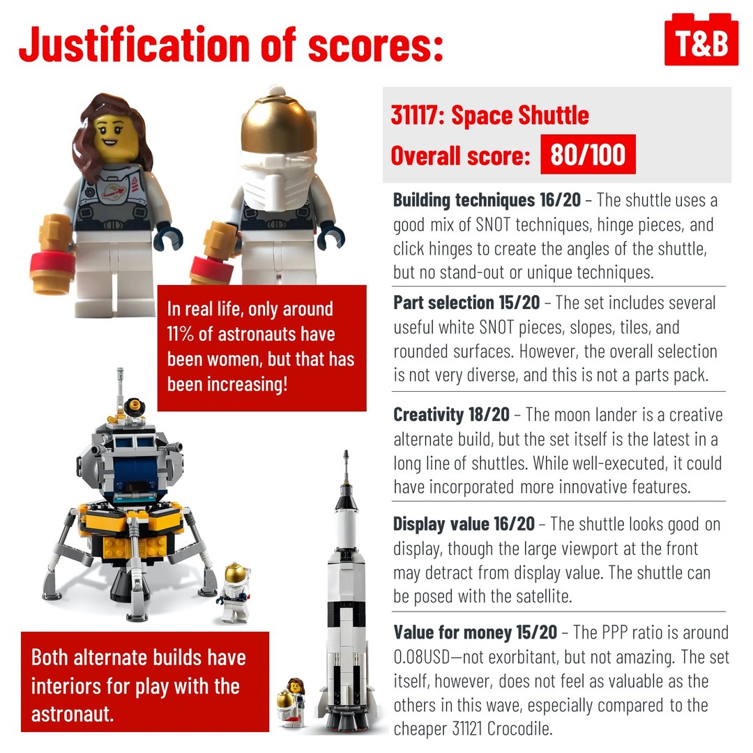 We also got our hands on 31117: Space Shuttle and loved this set, with a surprising number of techniques for a set of this size and 2 excellent alternate builds. The inclusion of a female astronaut is also fantastic, representing more women getting into the industry. Our only main issue was the slightly expensive price, especially compared to the cheaper 31121 Crocodile.