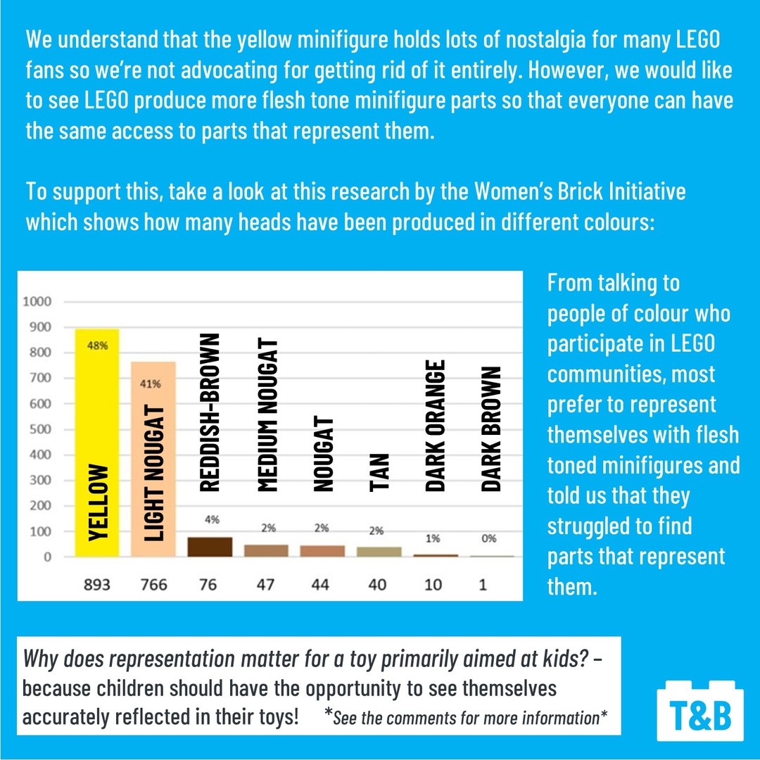 Our team’s view is that yellow does not represent everyone and we have therefore chosen to represent our team with flesh tone minifigures. We believe that our differences should be celebrated and that flesh tone minifigures are better at representing who we are.