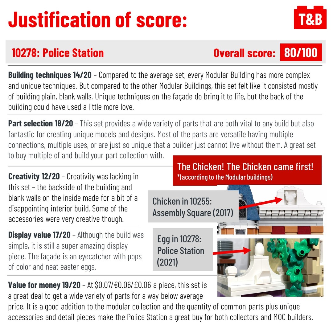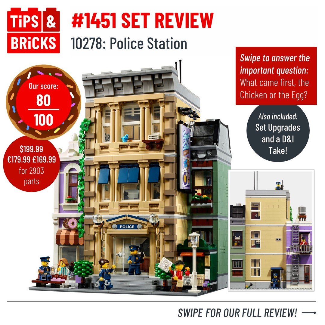 Today, we at Tips&Bricks share our review of 10278 Police Station, the 16th building in the Modular Building series. We were sent this set by LEGO but our view is unbiased and we aim to provide a unique review from the perspective of a MOC builder and fan of building techniques. We score sets out of 100, giving 20 points each for a variety of factors.
