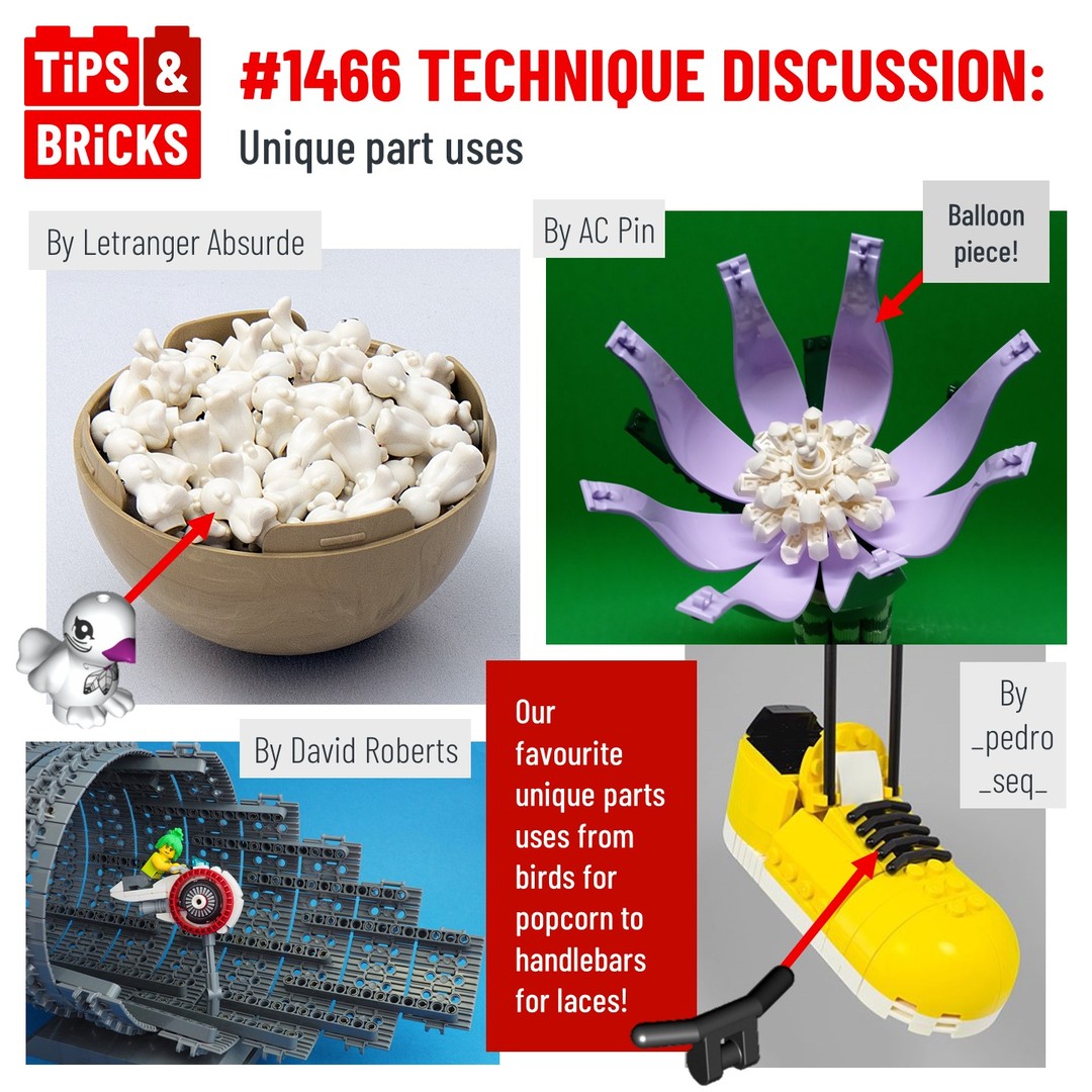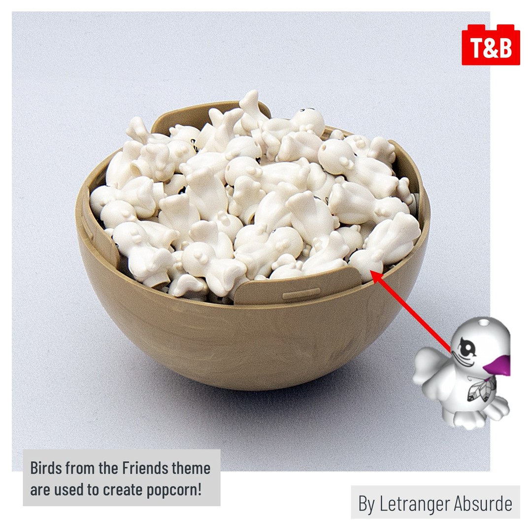 Today we’re looking at some of favourite unique and ingenious part uses! All 4 are fantastic but our personal favourite has to be the popcorn by Letranger Absurde, who makes fantastic use of the Friends Bird piece – he took the time to make sure each piece had no print showing! Which one is your favourite and why?