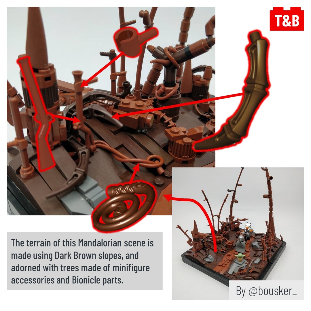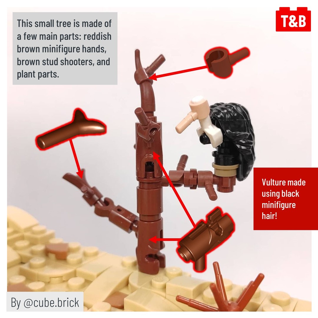 A few main pieces make up the bulk of the techniques: minifigure hands, carrot tops, and the bar holder with clip. These pieces are useful for their various connection points and rounded ends, both which make for useful features to build a tree. Some of the builds also use the iconic Indiana Jones whip piece to give the scenes a bit more life. Have you built trees in this way before? Share your favourite techniques below in the comments!