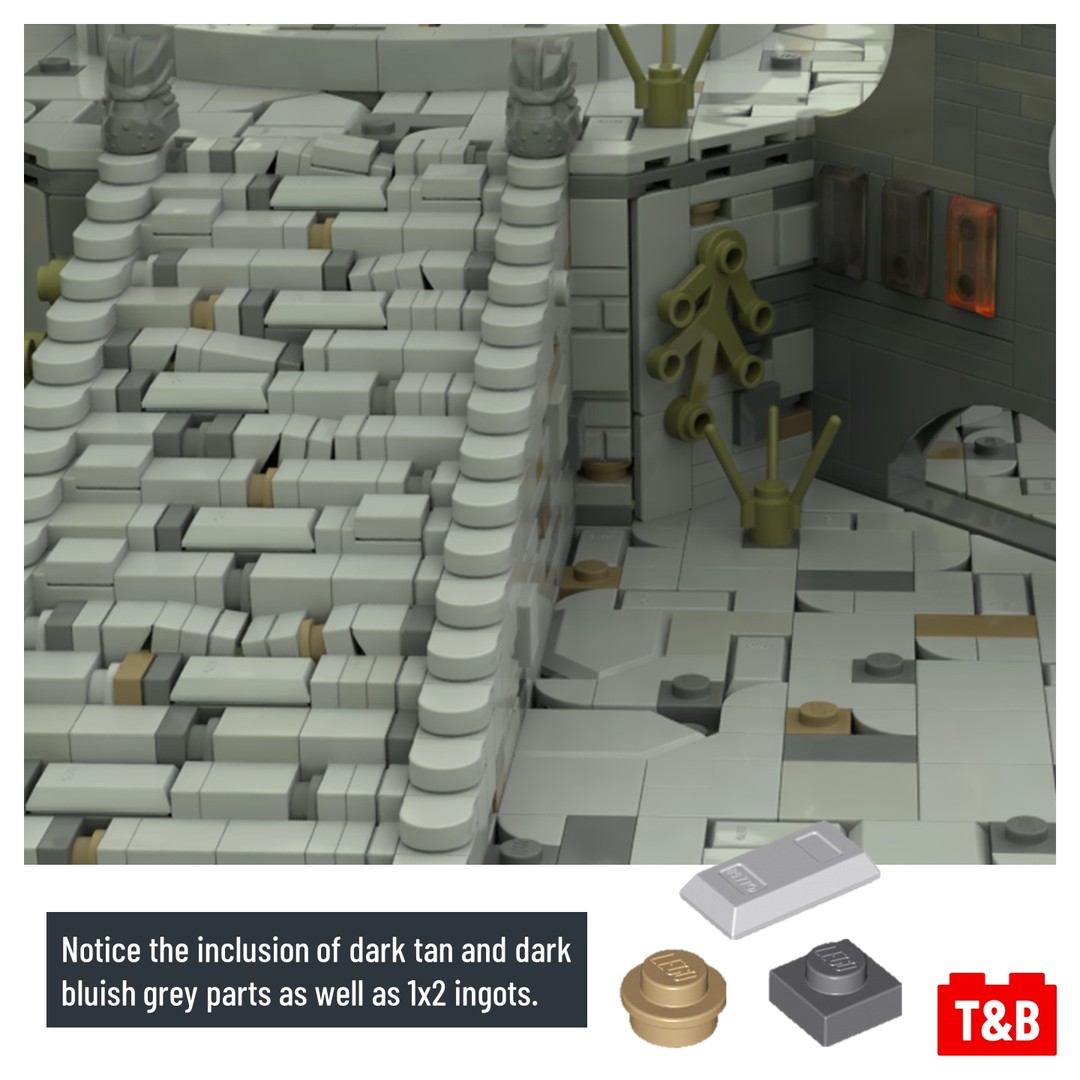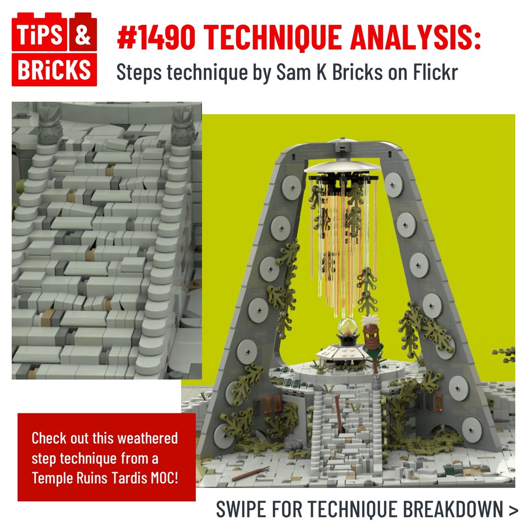 Today we’re featuring a breakdown of some weathered steps from Sam K Bricks’ Temple Ruins Tardis MOC! The entire MOC has this same effect to make the Tardis look forgotten, but the steps cleverly use SNOT bricks and hinges to make uneven levels.