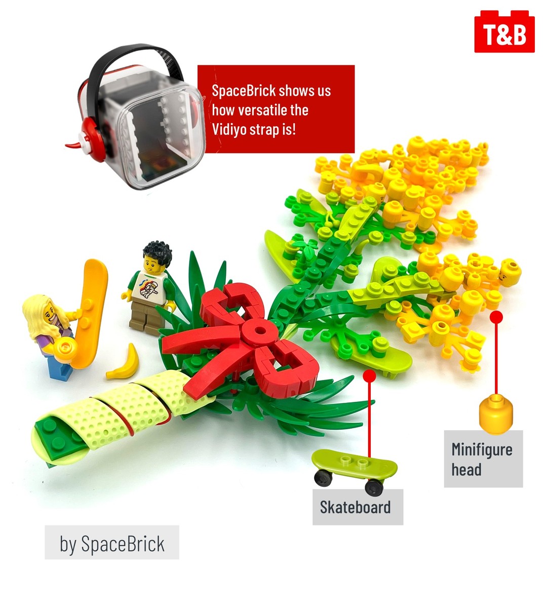 @dan.ko56 uses the thick, stud-less Vidiyo strap to create a smooth, sleek sci-fi speeder. Meanwhile, SpaceBrick on Flickr uses the Vidiyo strap as a wrap for a beautiful mimosa flower build.