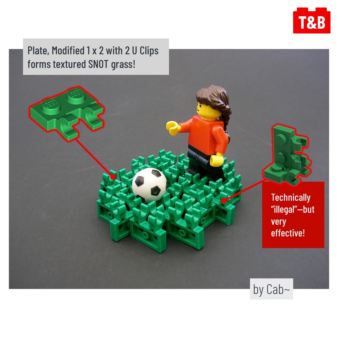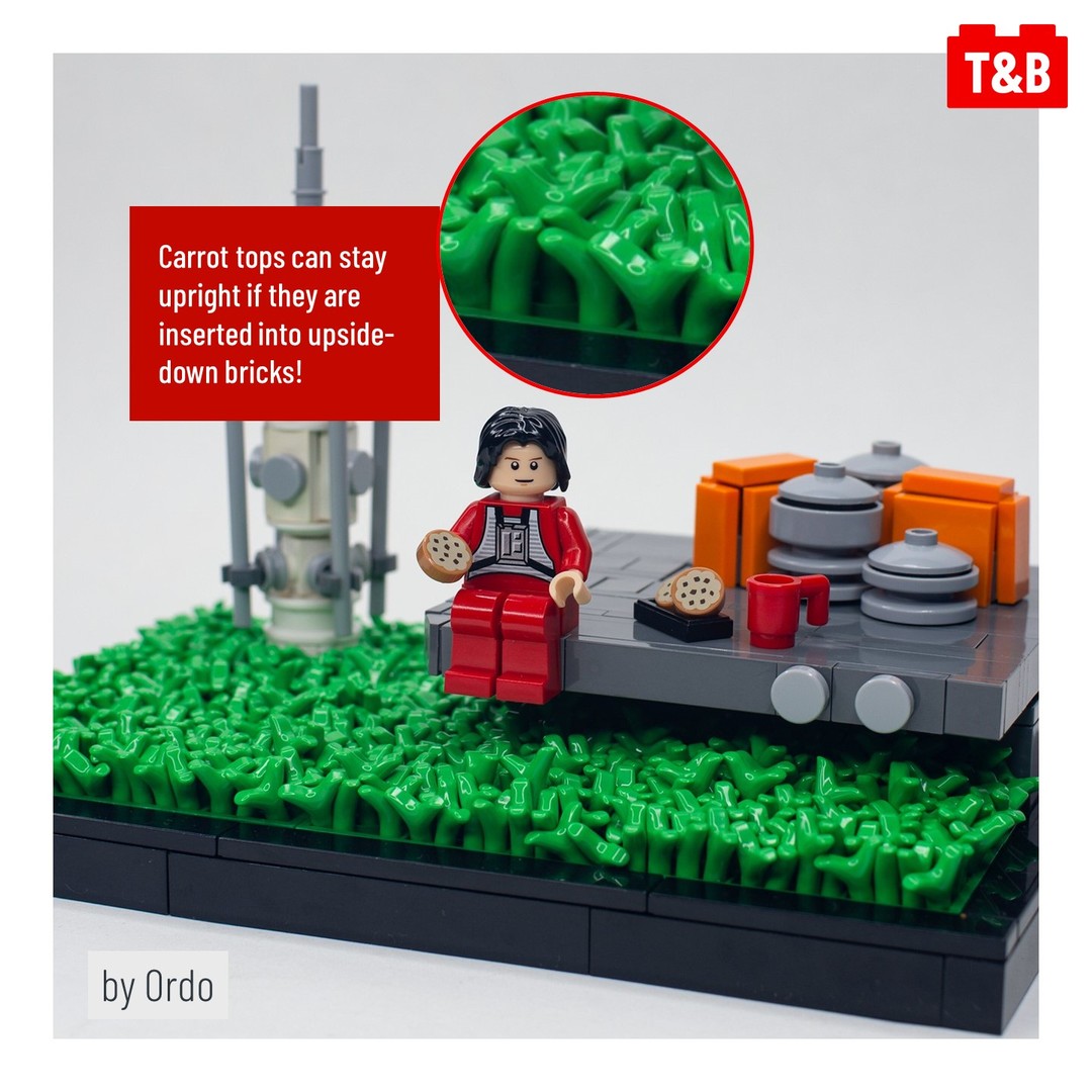 Meanwhile, @fullplatebuilds impresses with a great technique using cattle horns, and Cab on Flickr uses innovatively connected plates with clips—on their side! And @ordo_builds flips bricks upside down, before filling them with hundreds of carrot stem parts!
