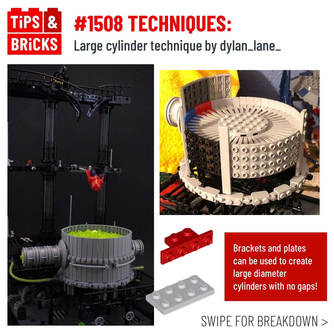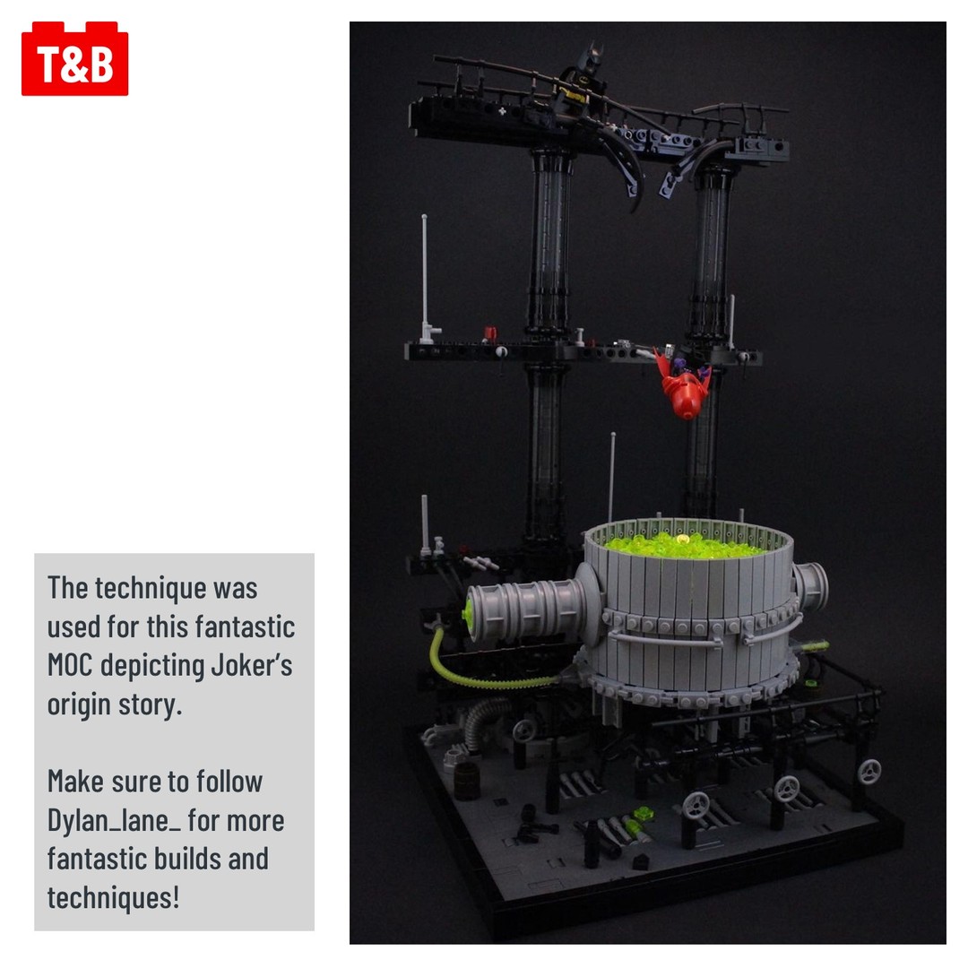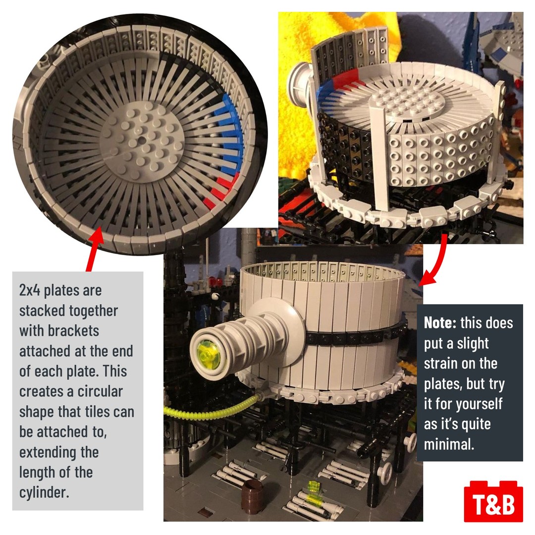 Today we’re looking at a fantastic technique to create a large round tank or cylinder with no gaps! Built by Dylan Lane for his Batman – Joker MOC, the technique uses 2×4 plates that are stacked together, but have 1×4 brackets at the end. This raises the end of the plates to create a circular shape that covers 360 degrees, and tiles can be attached to extend to your desired amount.