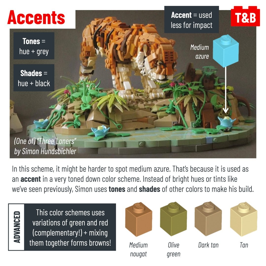 Additional takeaways from this post that are subtly hinted throughout the post, such as mixing complementary colors to make brown, but we also highlight something important to consider outside of your builds: their background. How can the background do more for you than just a blank surface? Can you actually use it to enhance the colors or the texture of your builds? This can help your builds look great and stand out in competitions, on photos feeds, or in your portfolio!