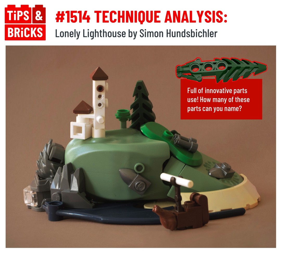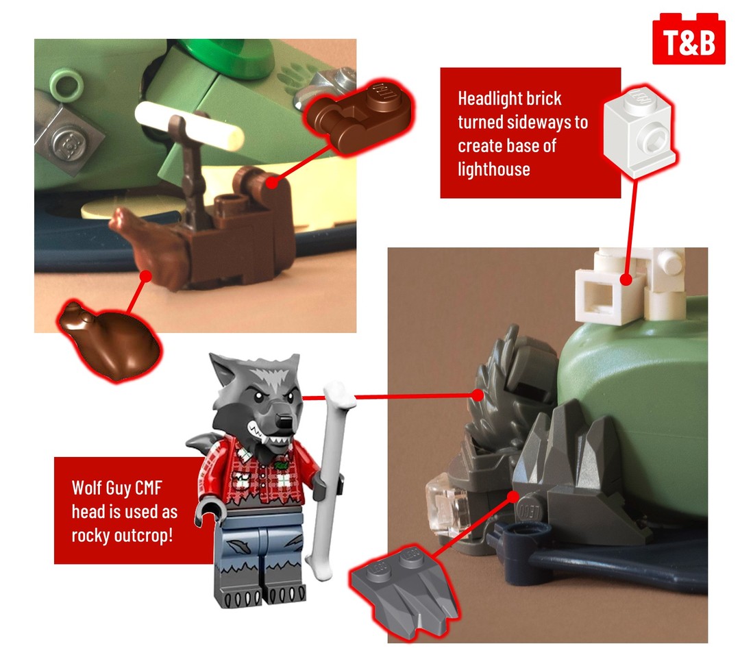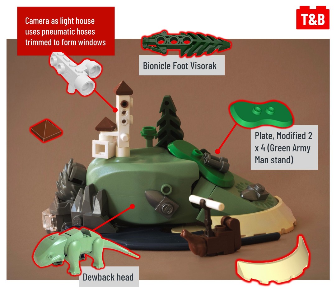 Highlights for us include the use of a Visorak Bionicle foot as a tree, a classic Star Wars Dewback’s head as the island itself, a dragon wing as the ocean, a werewolf head as a cliff, and a camera and pneumatic hoses as the lighthouse!