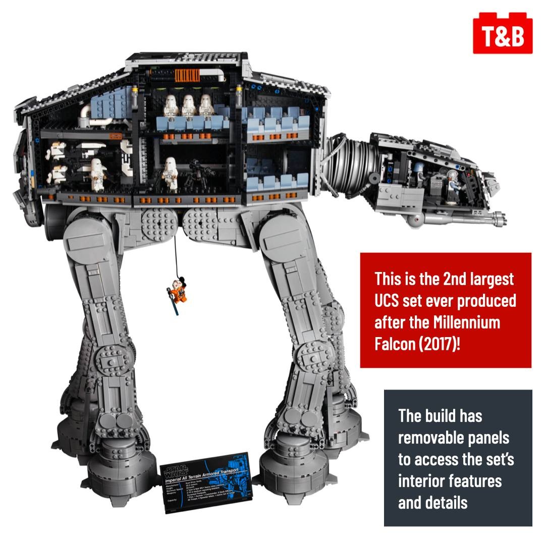 A whooping 6785 pieces, this set has become the second largest UCS set after the 2017 Millennium Falcon. It features a movable head, spinning guns, adjustable legs, and side panels that open to reveal amazingly detailed interiors. The set also comes with 9 minifigures, 5 of which are unique, as well as 2 speeder bikes and an E-Web cannon. And the inside of the AT-AT has room to seat 40 troopers at a time!