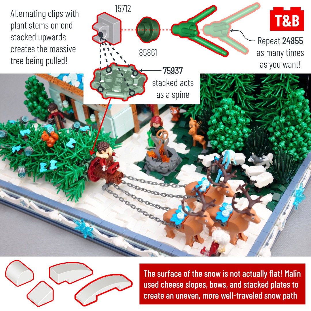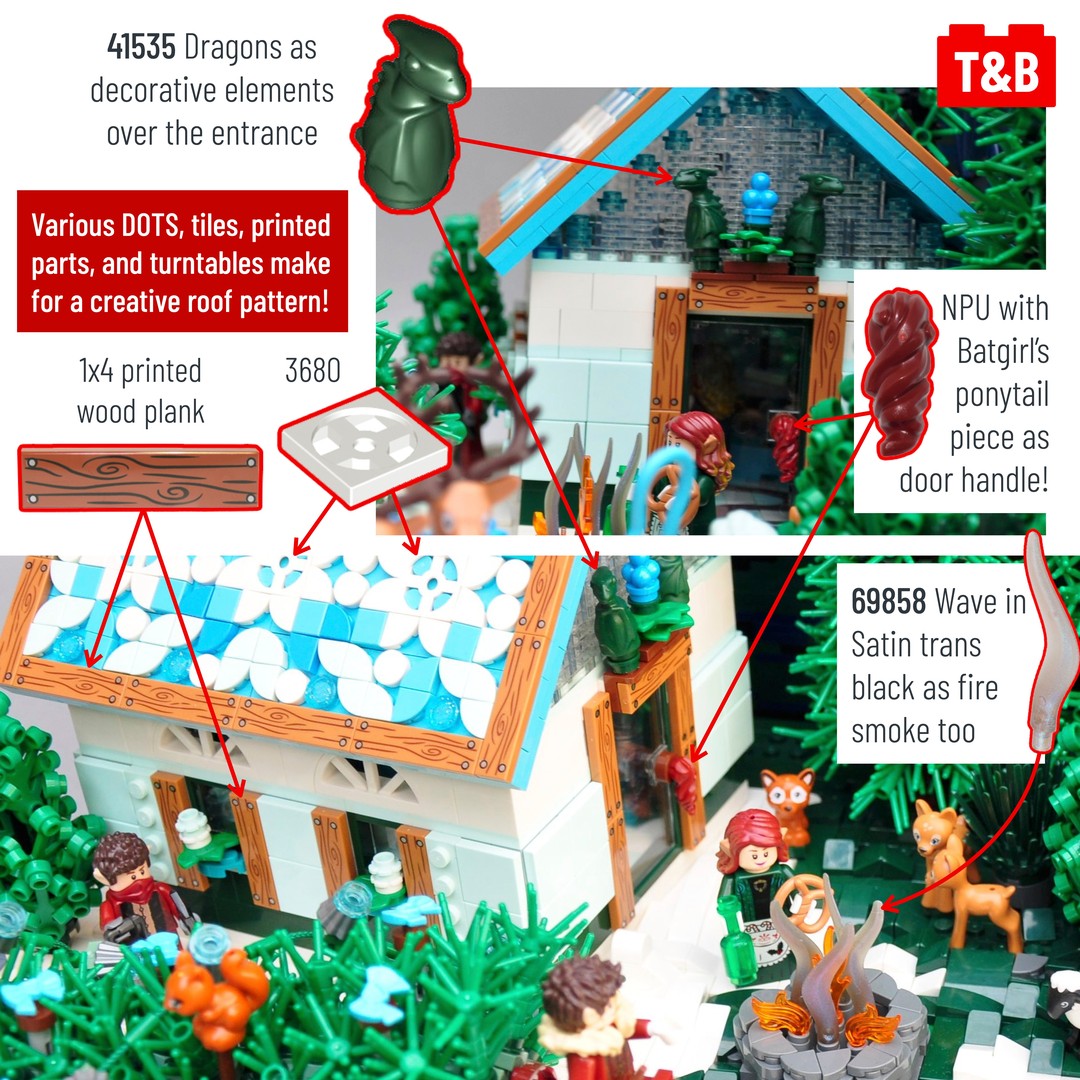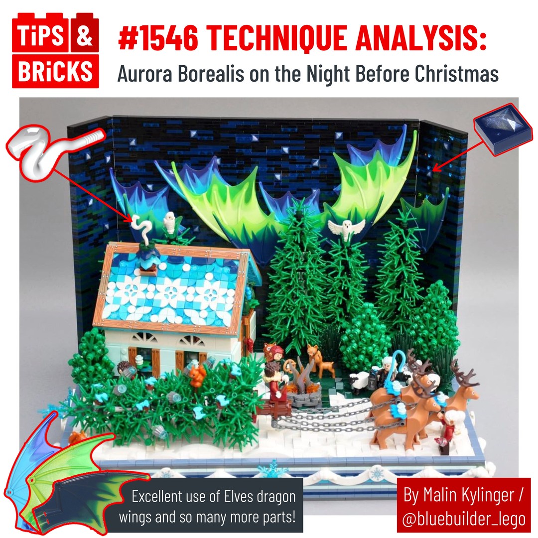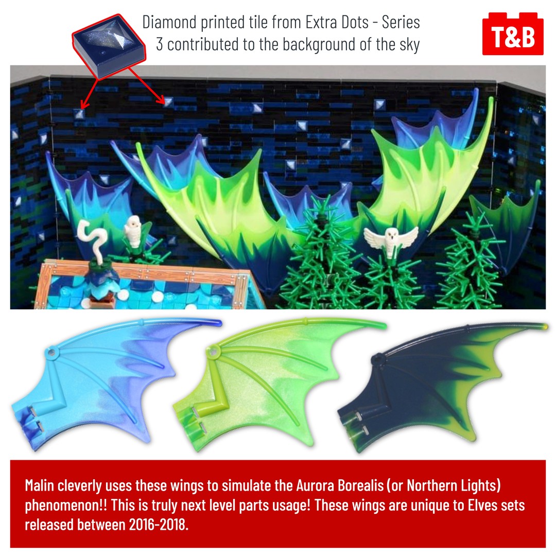 Today we’re breaking down a lovely Christmas themed build by Malin Kylinger aka @bluebuilder_lego . There is clever part usage throughout the MOC–from the turntable as part of the roof tiling to Batgirl’s ponytail piece being used as a door handle. But perhaps the most impressive and eye-catching parts are the dragon wings used to simulate the Aurora Borealis phenomenon in the sky. The color selection is absolutely perfect, ranging from bright green to dark blue, and all the wings are set against a backdrop of dark blue and black sky speckled with stars (another NPU with a printed piece). It’s truly an impressive build!