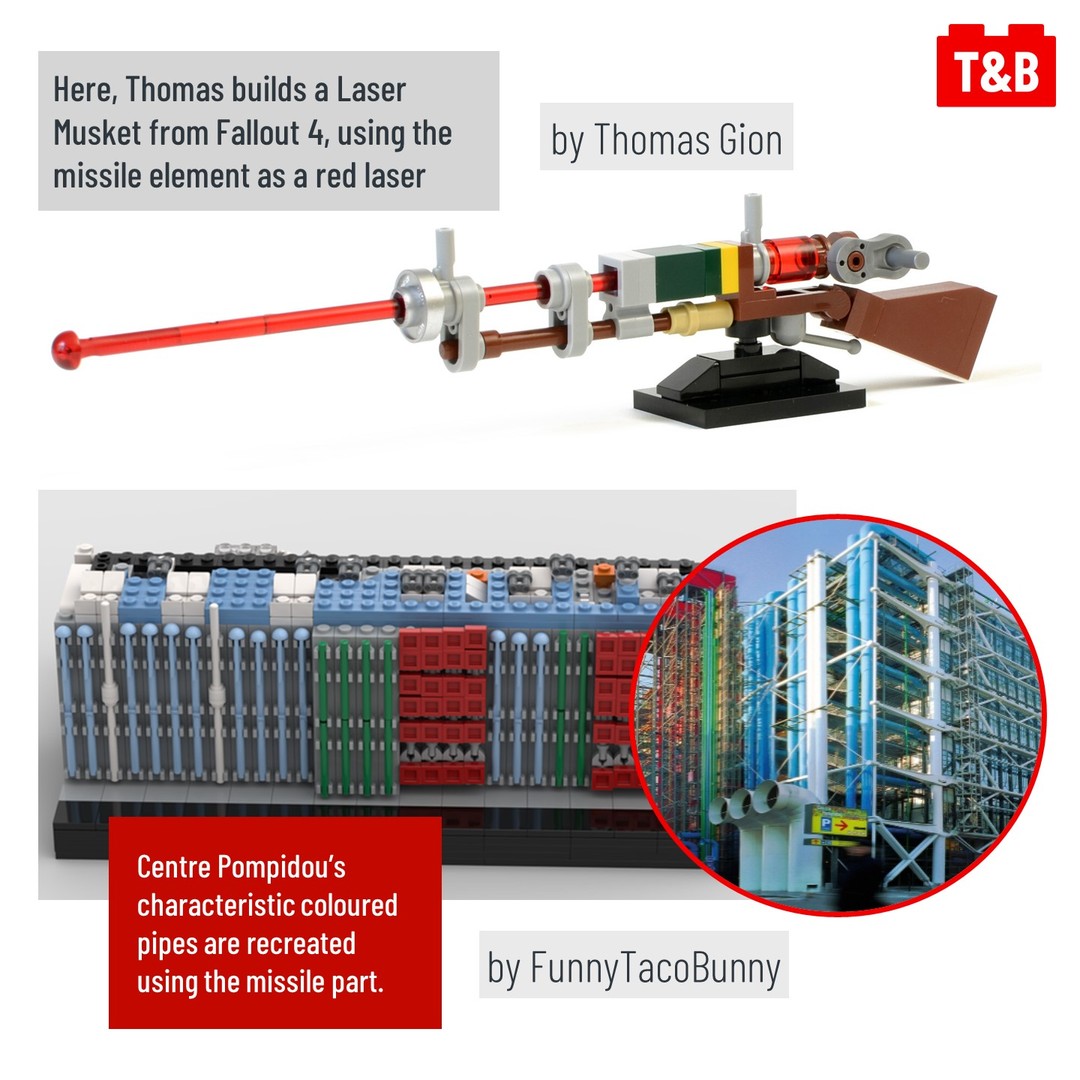 This is no flickfire missile—these sleek projectiles can be fired forcefully from LEGO’s spring-loaded shooters, but that’s not the only use for these elements. With plenty of interesting variants such as a water themed missile and a missile with a grappling hook component, this part has been used by @bluebuilder_lego to represent glowing energy, and by Sam J.J. on Flickr to represent magical spells. Meanwhile, Thomas Gion on Flickr uses it to represent a weapon from the video game Fallout 4, @thisonebrick creates the yards of a square-rigged sailing ship, and @funnytacobunny on Rebrickable uses it to represent a microscale version of the iconic Parisian building Centre Pompidou.