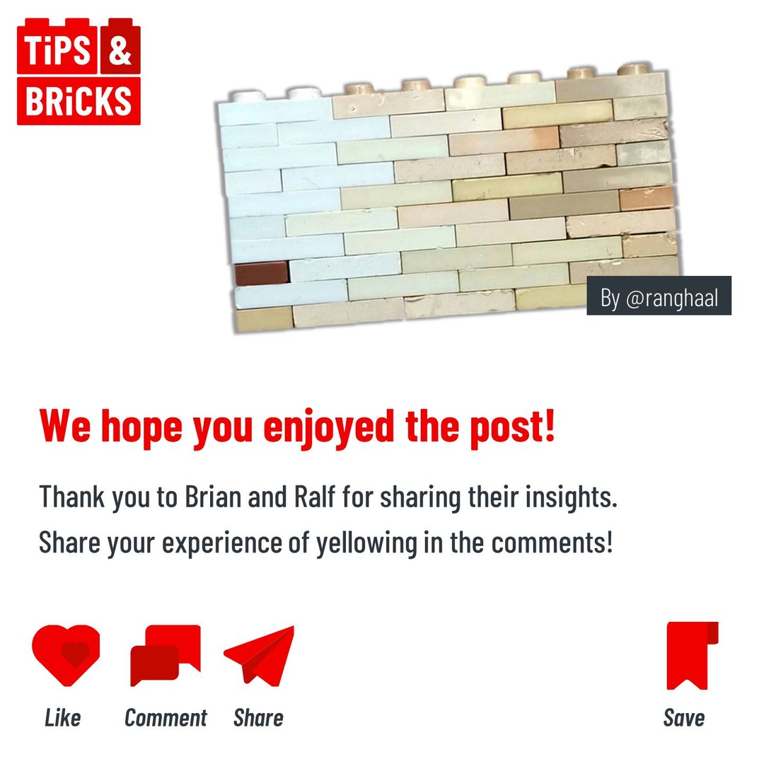 Thank you to Brian from @stlbrickco and Ralf from @ranghaal for sharing their insights with us for this post. If you have experience of yellowing, either good or bad, please share it in the comments!