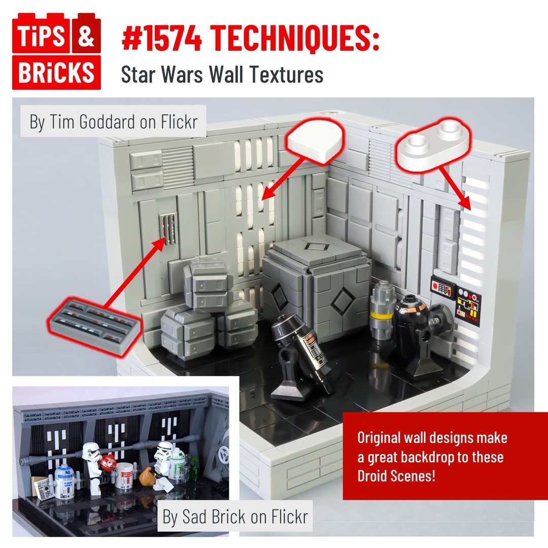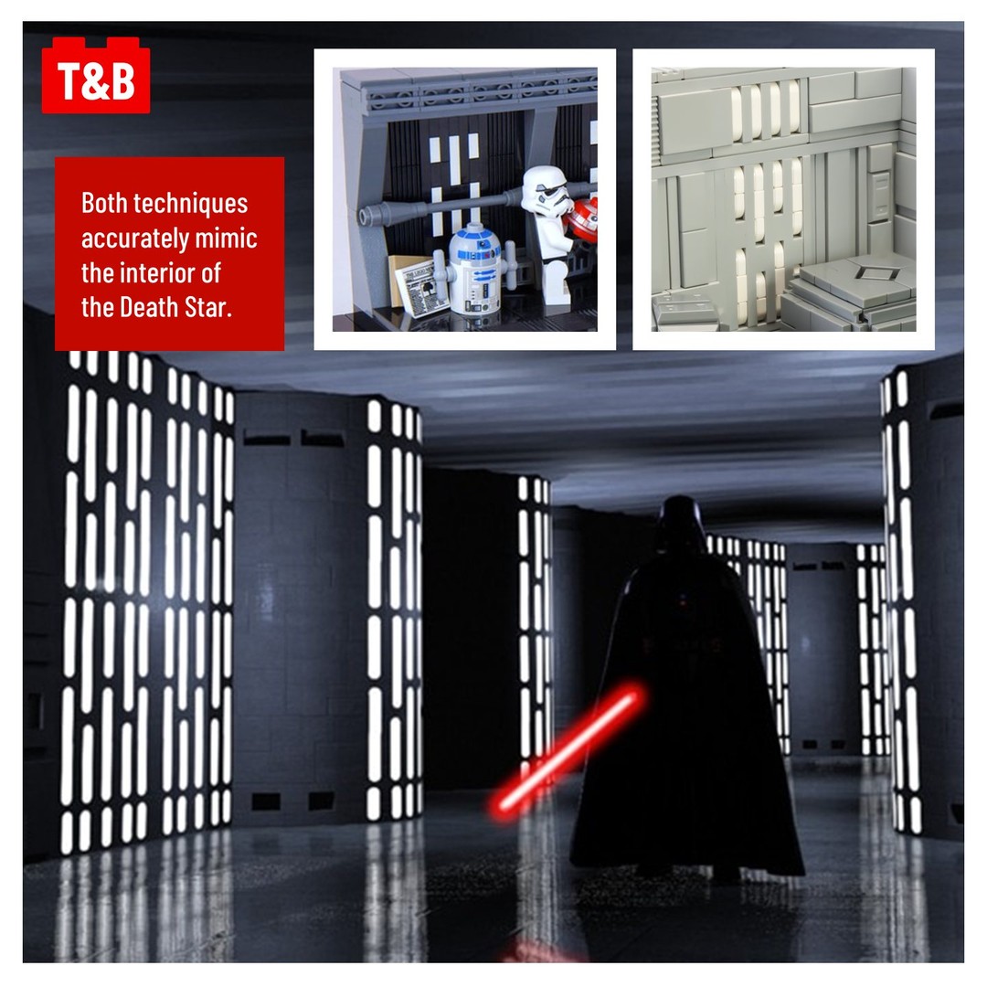 Today’s technique post serves as a great backdrop to “display droids and stuff,” as the builder @tim_goddard928 says. Although it uses a simplistic colour palette, the techniques do an excellent job emulating the interior of the Death Star from Star Wars Episodes 4 through 6. Subtle insets and protrusions, coupled with consistent vertical and horizontal lines, create an industrial-sci-fi appearance perfect for any Star Wars diorama.