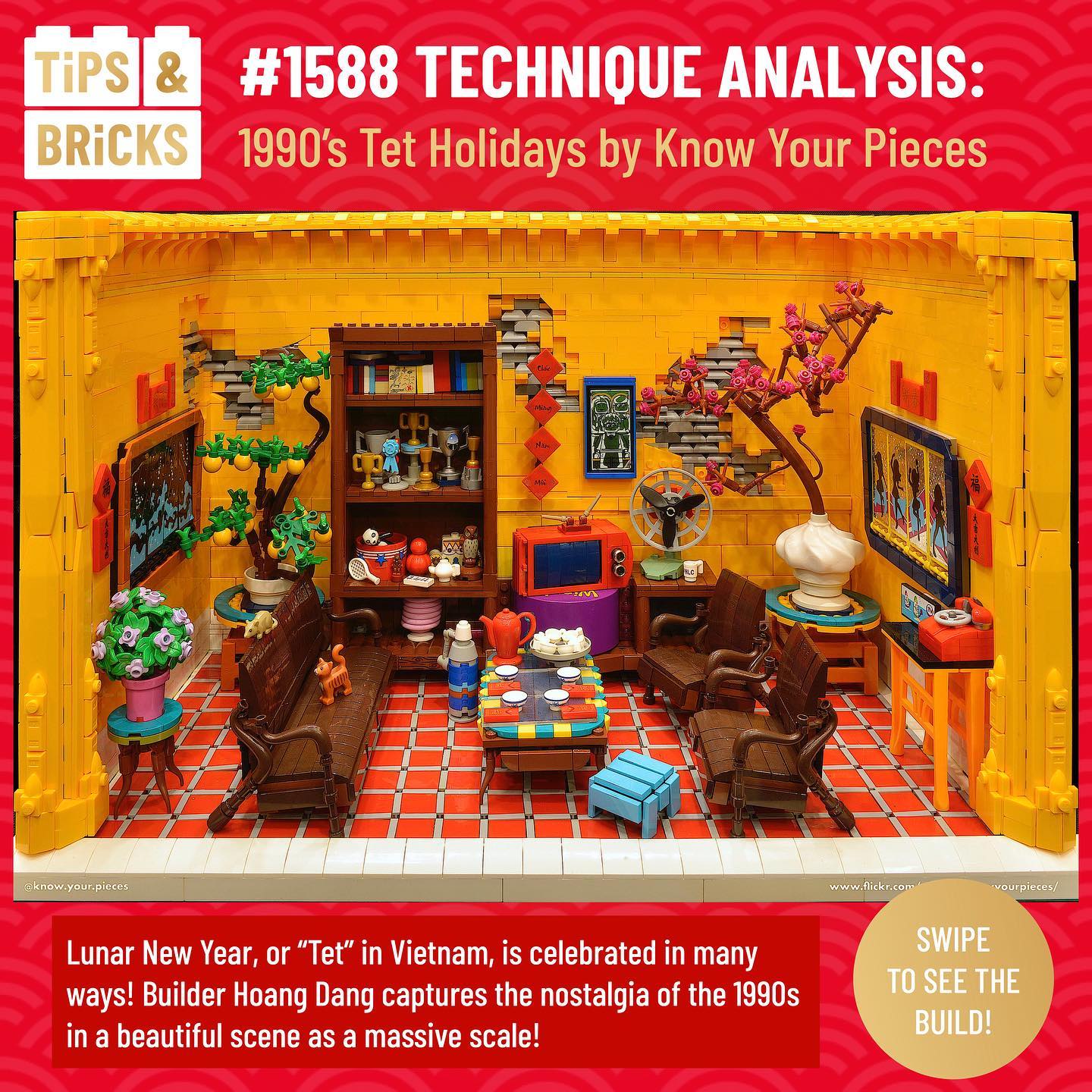 Today we’re getting a look into the nostalgic world of Lunar New Year in Vietnam thanks to @know.your.pieces ! The past comes to life in great detail–and at a large scale! From the mesmerizing red floor (and interesting technique) to all the festive adornments of the holiday to “outdated” technology, the build is packed with little details and fascinating builds within the larger scene. Come take a look!