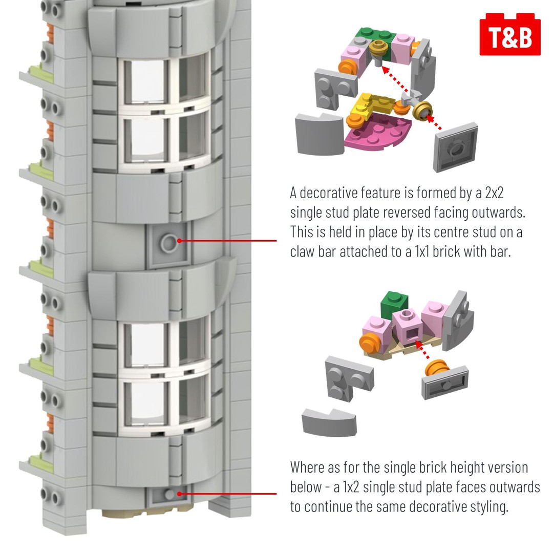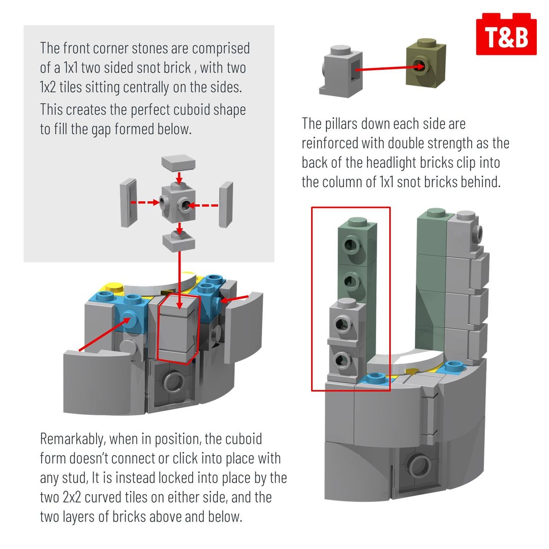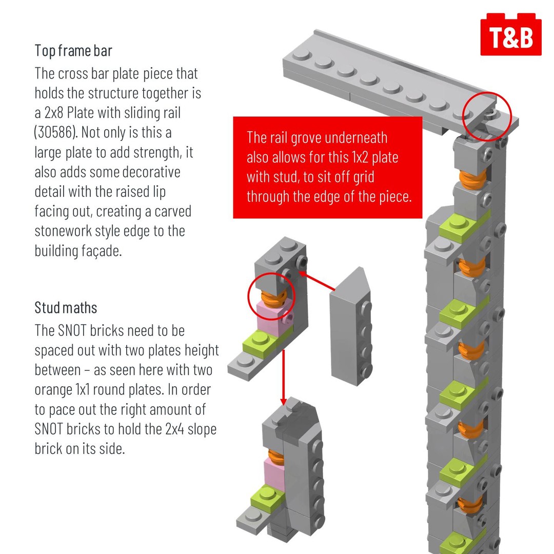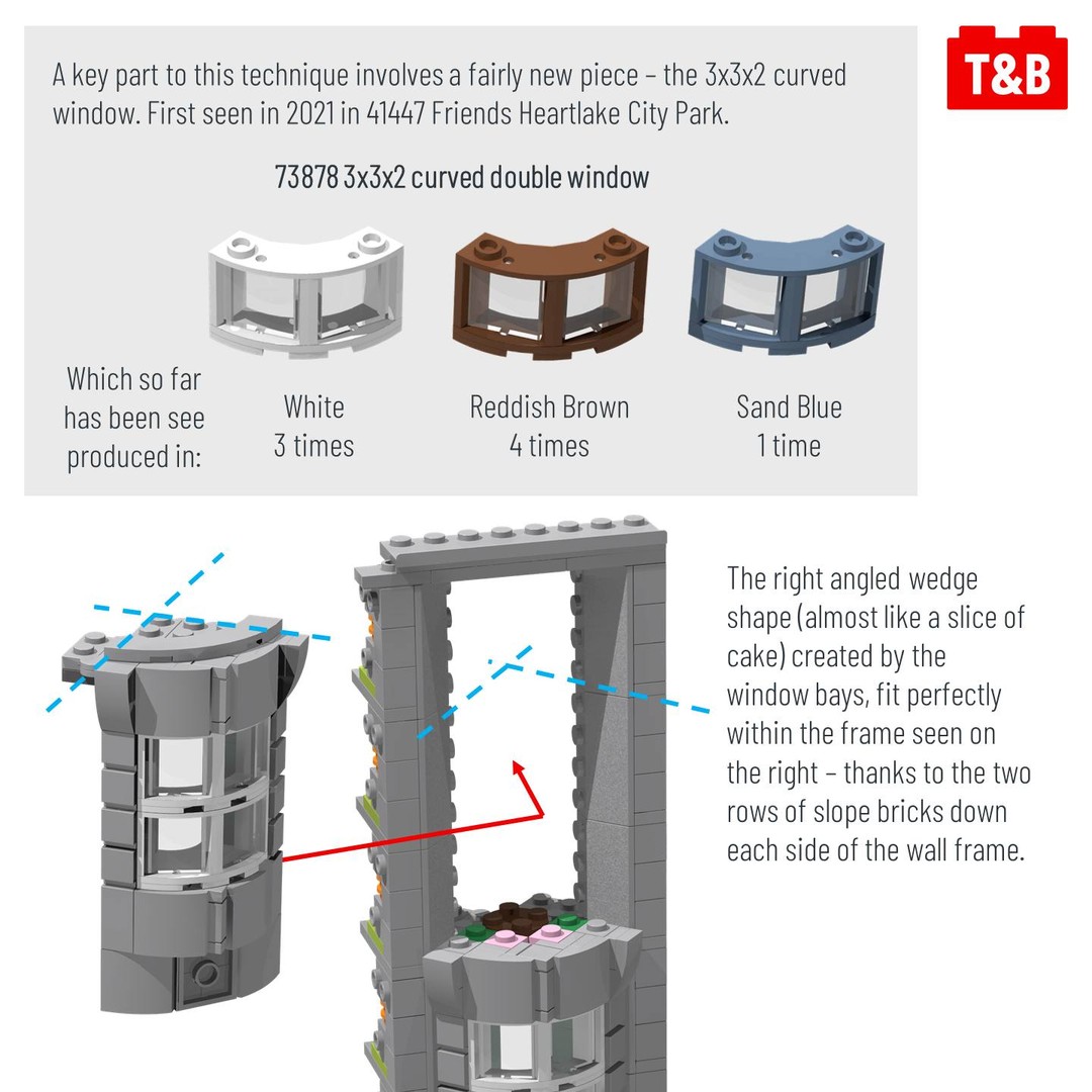 They have chosen to feature the 3x3x2 curved brick piece for the actual windows, which that decision seems to have then influenced the thinking for how the rest of the building façade works with that piece. The curves from the windows are continued all the way up in the stonework styling, with a few 2×2 curved plates applied to SNOT bricks. These curved plates lock into the front point of the curve to hold into place bricks that are not held or connected by studs. A not so traditional technique yet so successful and ideal for this finish.