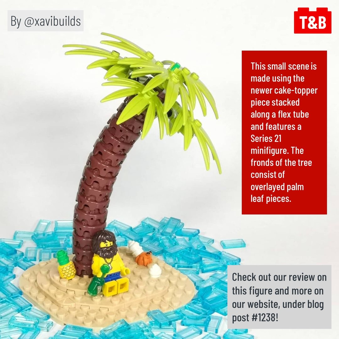 Using the flex tube, each tree is bent over much like many of their real life counterparts. Each trunk is made of stacked parts, whether hollow 1×1 round plates, Queen Watevra Wa-Nabi crowns, or recently-released cake topper pieces. These builders show that, with a few types of reddish brown parts, a flex tube, and some fronds, you can make an extremely convincing palm tree!