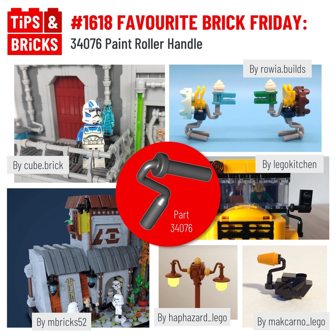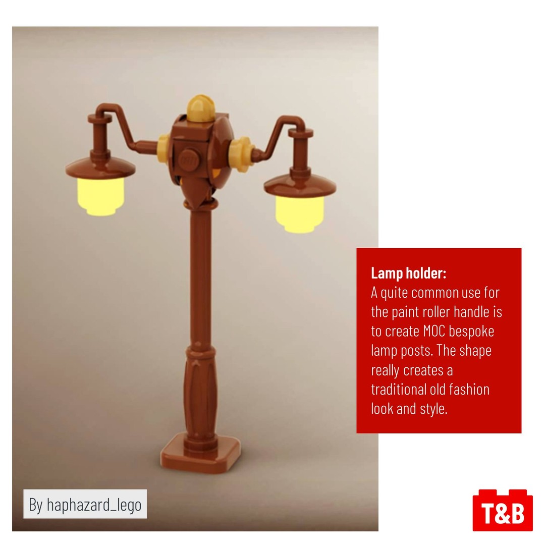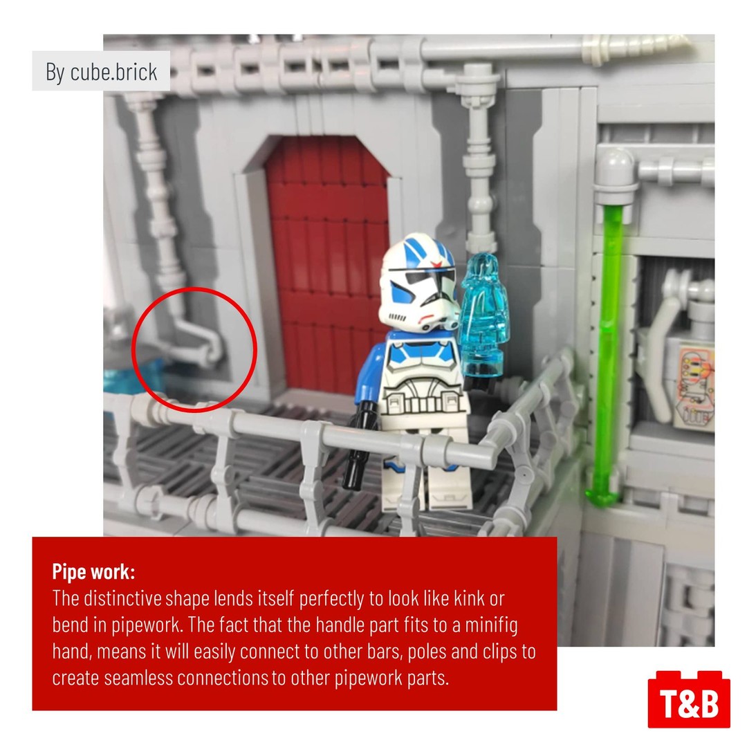 For a purely decorative feature, why not add some dynamic bends to your pipework or railings on your MOCs. Cube.brick has seen the potential in the paint roller handle as the ideal piece to change direction in their pipework made from bars and lightsaber handles.