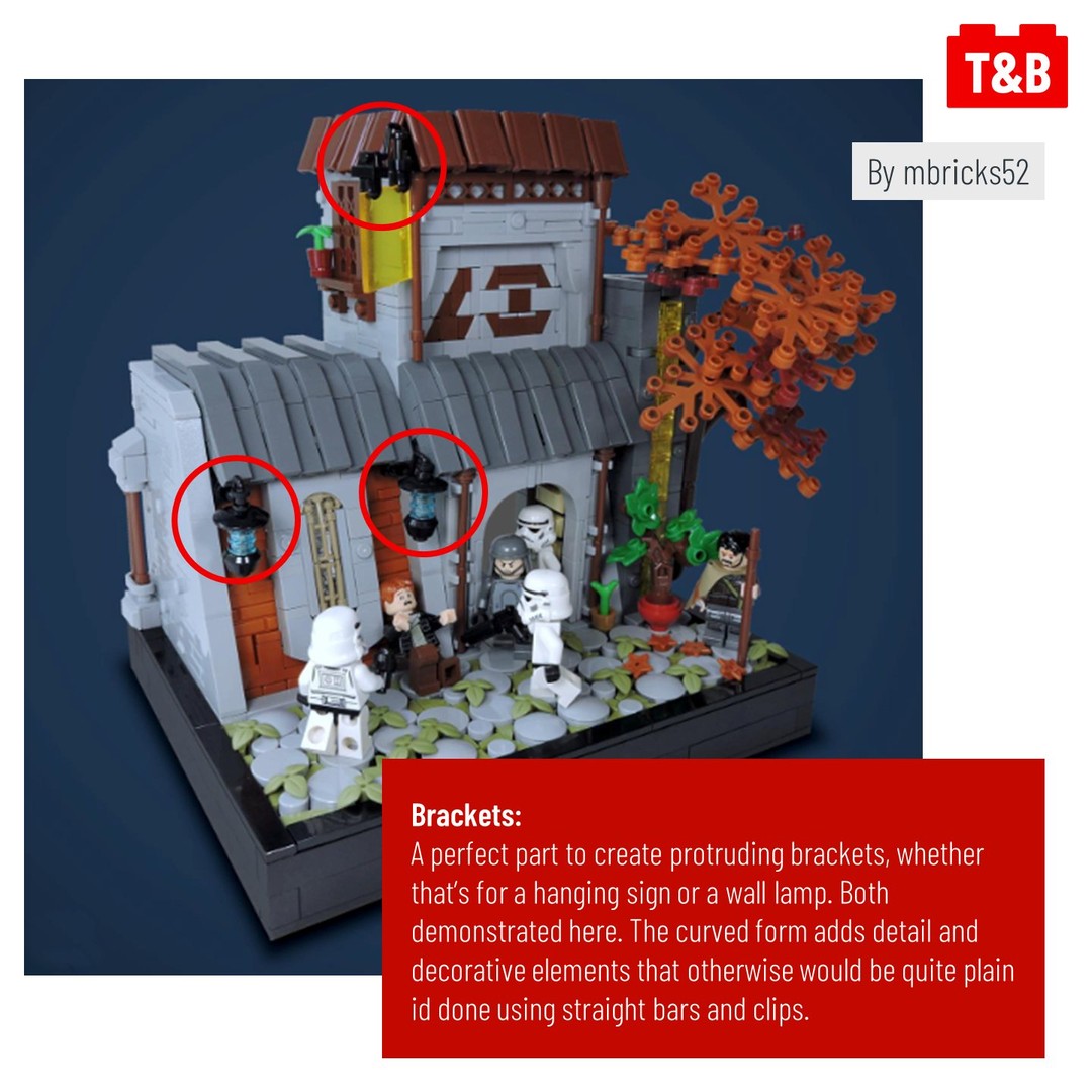 Otherwise, the part offers MOC builders a functional yet decorative connector piece. Whether that’s as a bracket for hanging sign, street lamps or wing mirror. Perfectly demonstrated by mbricks52, haphazard_lego and legokitchen.