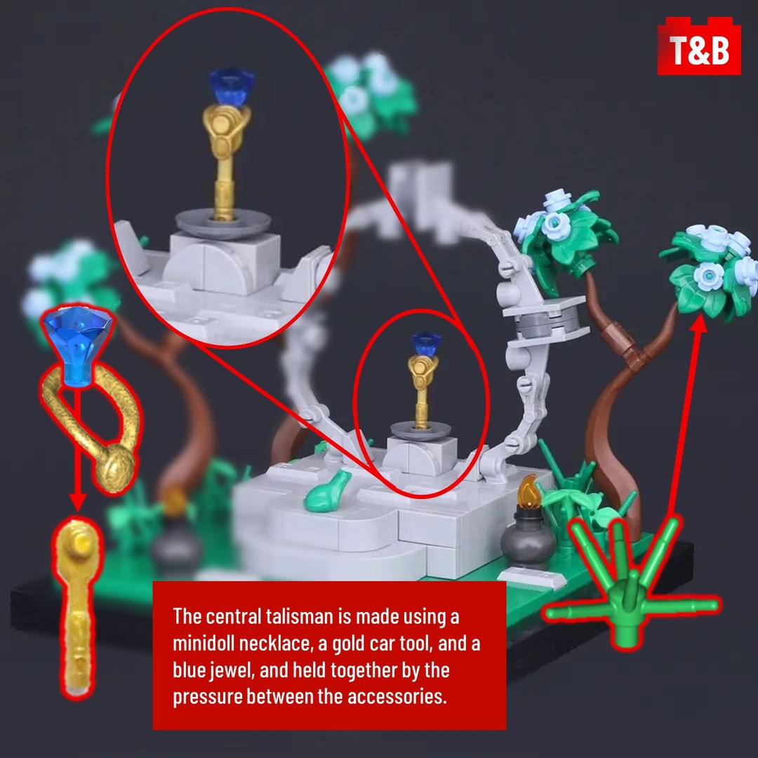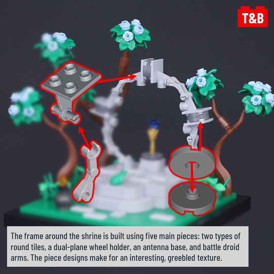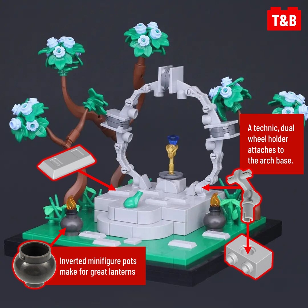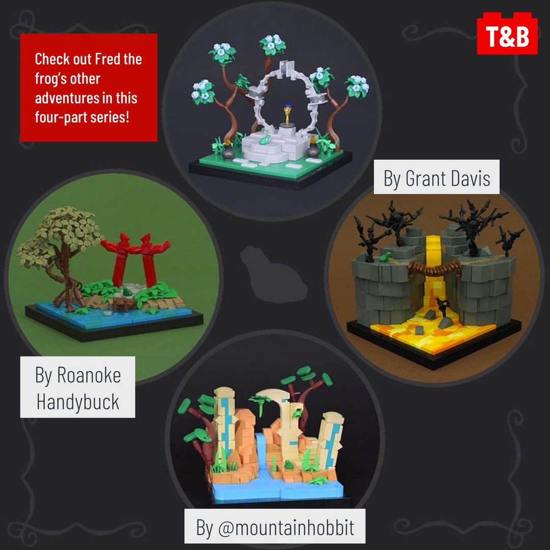 Today’s Technique Analysis analyses Eli Willsea’s build, “Fred’s Adventures: The Portal.” Using a relatively low number of pieces, Eli creates an interesting minifigure (or frog-figure) scale build. As part of a four-part series of Fred’s adventures, this scene is set in an earthly forest and is centred on the portal that Fred approaches. This build makes especially good use of dual wheel holders commonly used in official LEGO planes – they both make up the structure of the portal as well as connect it to the ground.