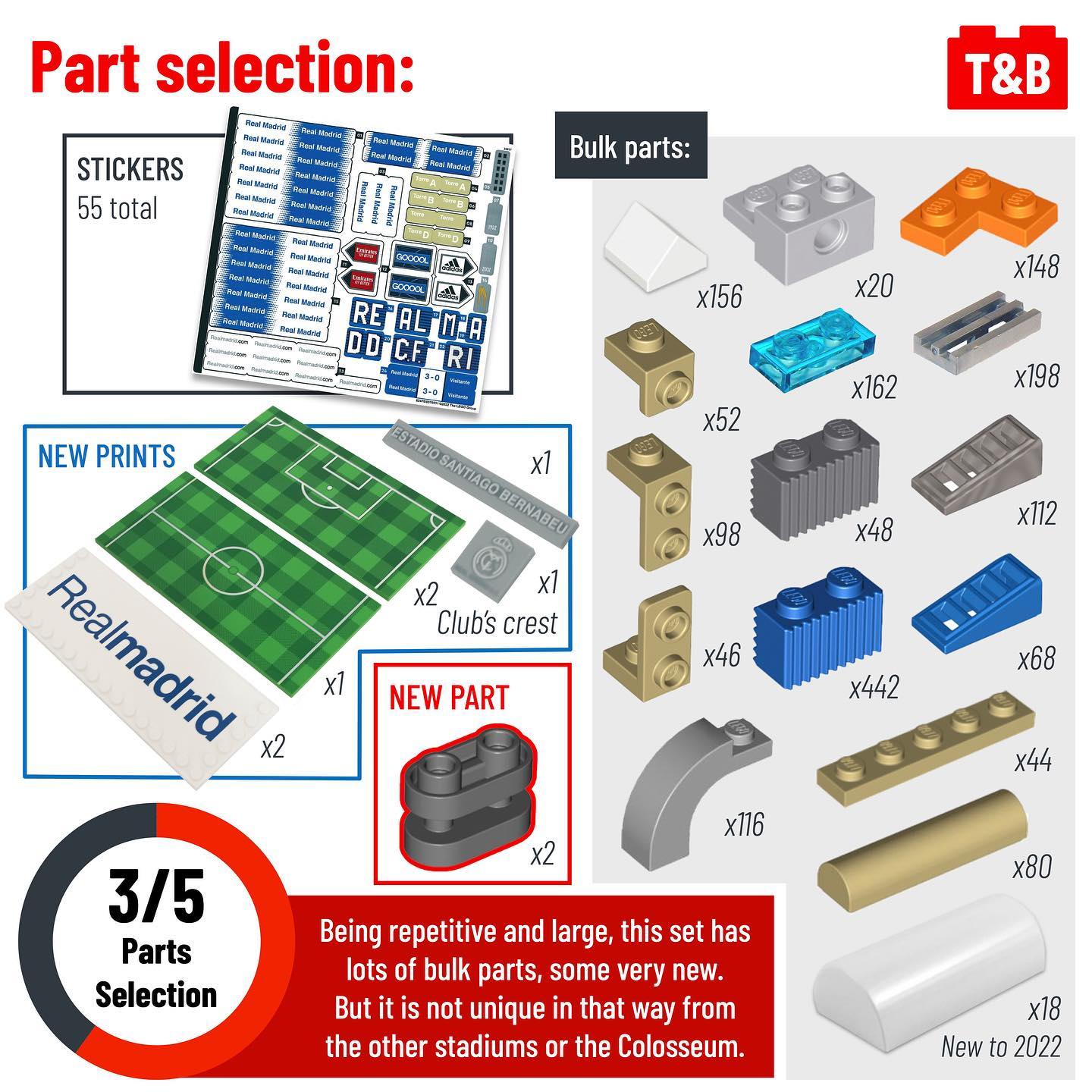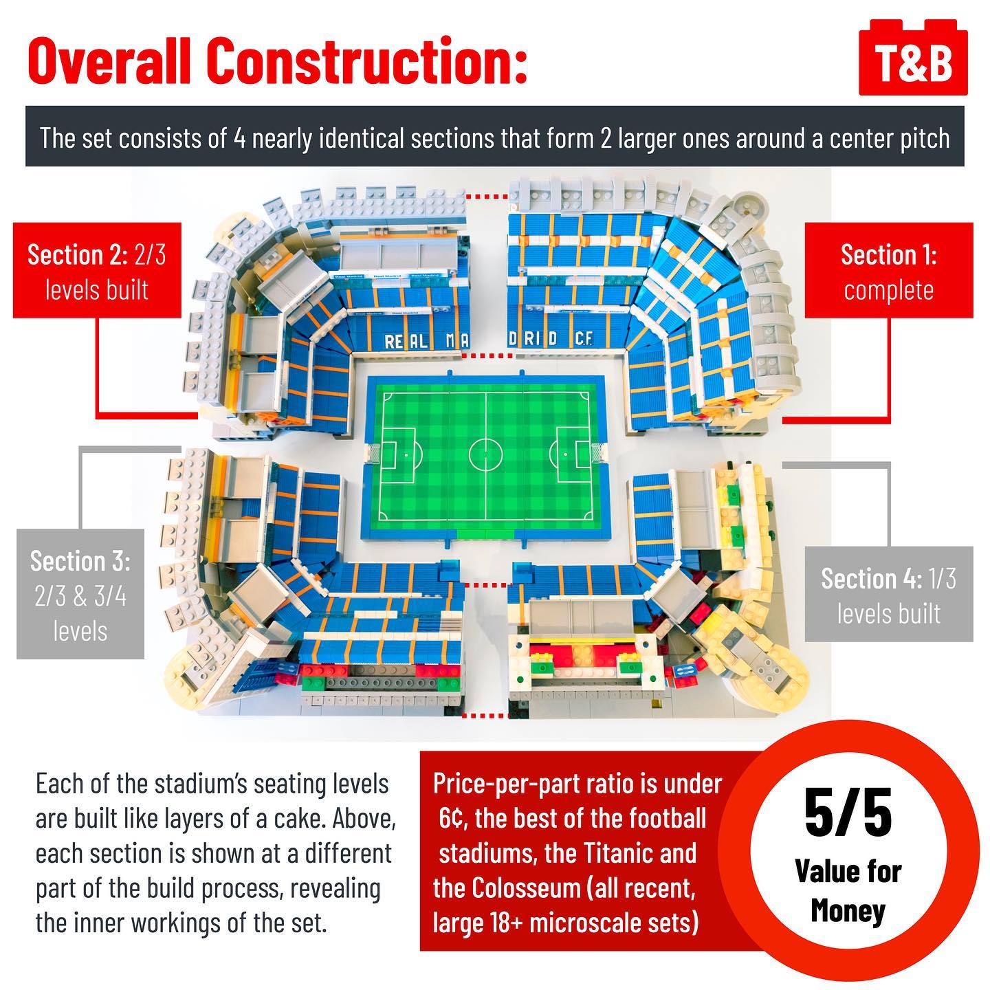 Having not personally reviewed the other stadiums, it is hard to say if this is the best one yet, but it does certainly seem that way. From reviewing the building instructions for Camp Nou (reviewed on this blog in post #1554) and Old Trafford, Bernabéu Stadium seems more sturdy and has less large parts to move about. It does suffer from being entirely repetitive, making the already long build very tedious. But if you’re a Real Madrid or microscale fan, this set will have many interesting features for you!