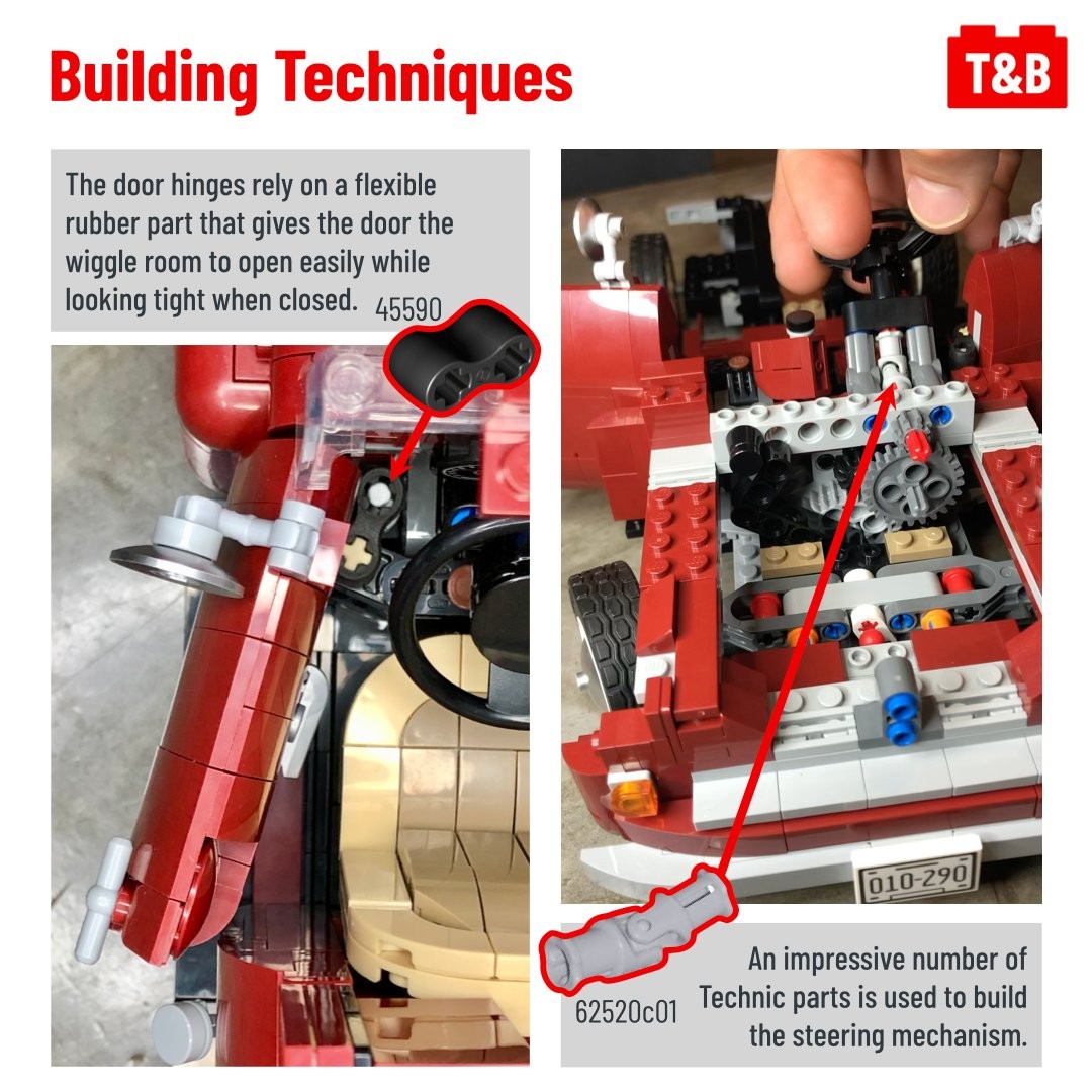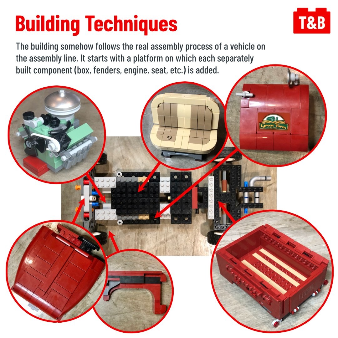 The build follows the manufacturing process of a real car, starting by a platform on which components are mounted. It features a few Technic sections, lots of SNOT construction, but overall not particularly creative techniques.