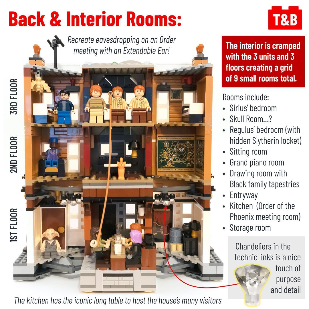 We really enjoyed this set, though it did look bigger in the release photos. The real build was much more compact, but very sturdy when moving it around by the base. The back of the build that is open like a dollhouse but feels cramped with a whopping 9 different rooms in 12 Grimmauld Place. We wish there may have been less rooms in favor of more detail, but the details we do get are quite interesting, most notably the famous Black family tree tapestry.
