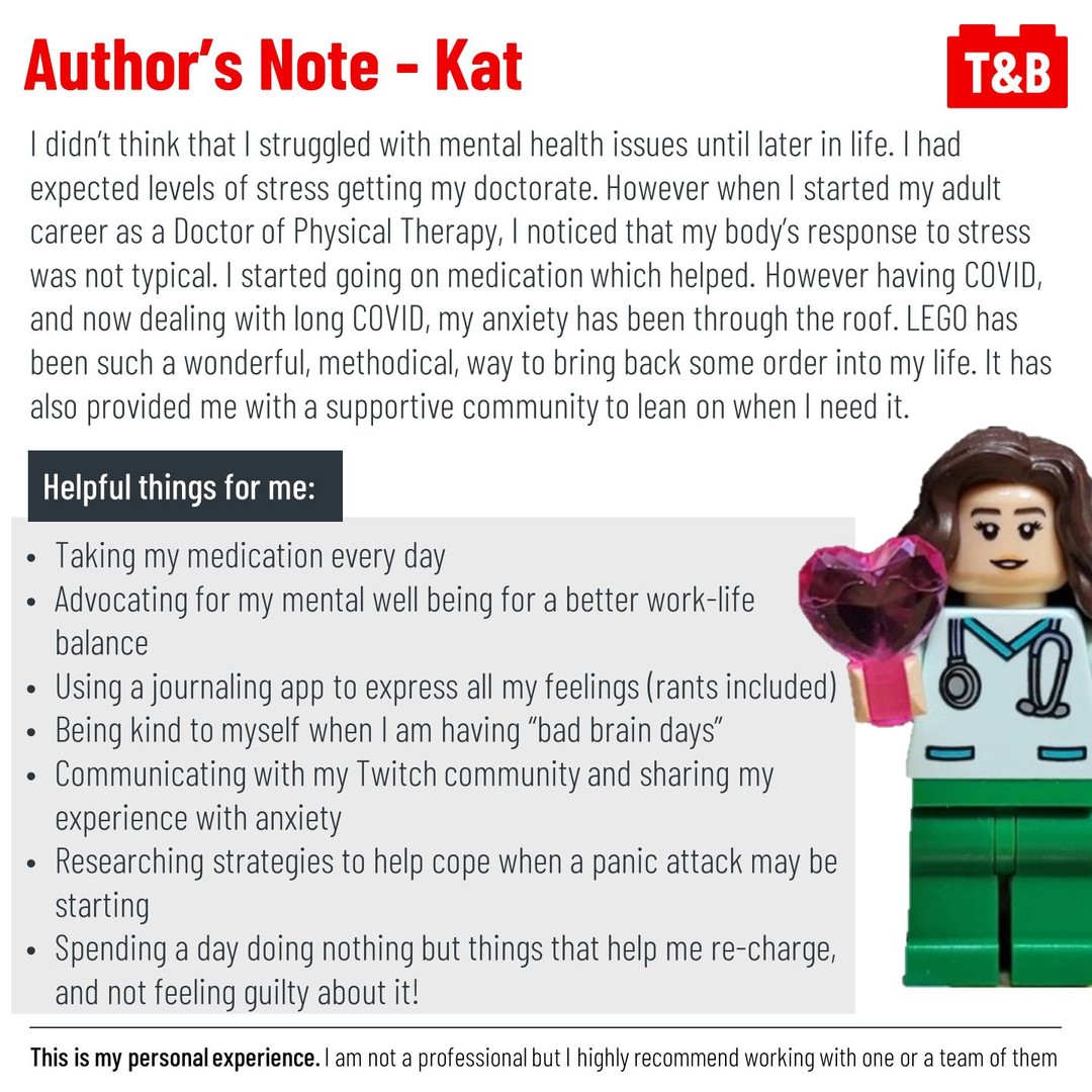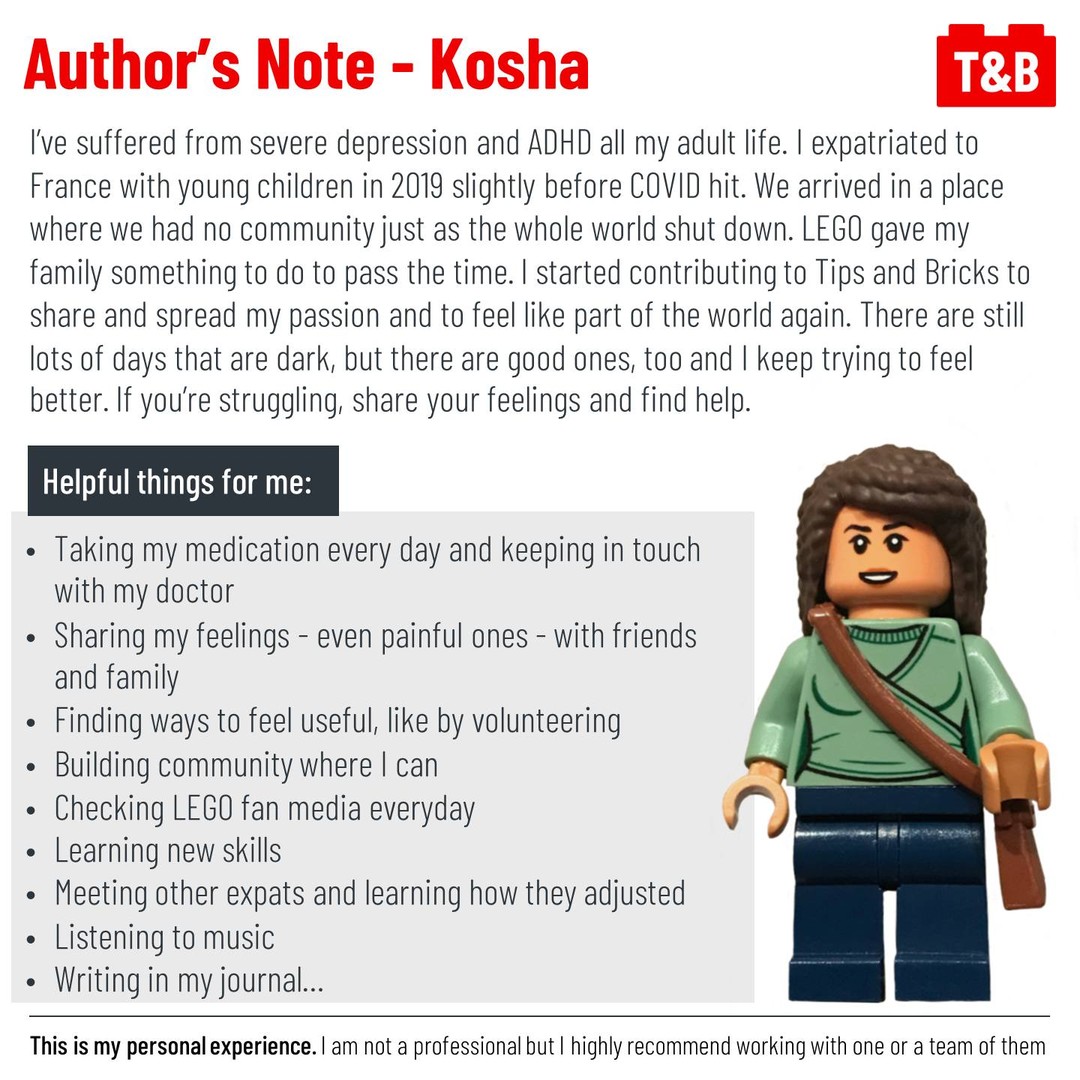 If you are comfortable doing so, please share your experiences with mental health and / or LEGO in the comments and let’s have a discussion.