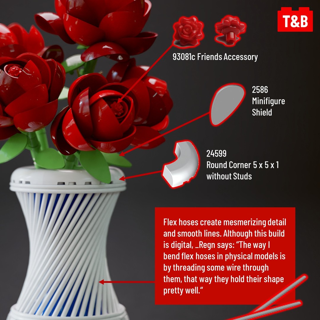 In today’s technique analysis, we look at an elegant and beautiful bouquet that would make anyone swoon! _Regn uses shields, buildable figure parts and hot air balloons to create this stunning build full of smooth curves and rounded surfaces. Some of the parts, like the minifigure shield, are not yet available in the colours used— showing the possibilities of digital building!
