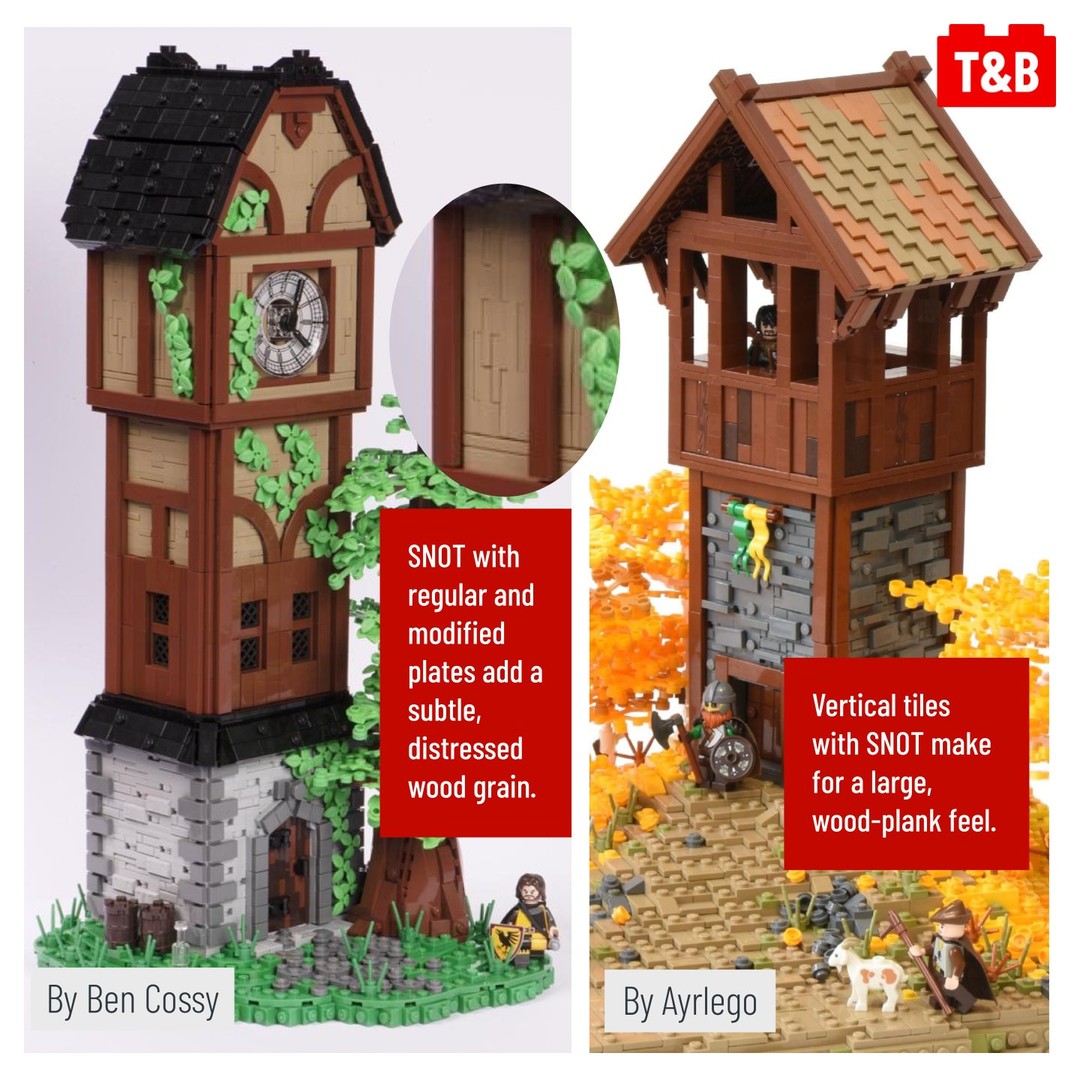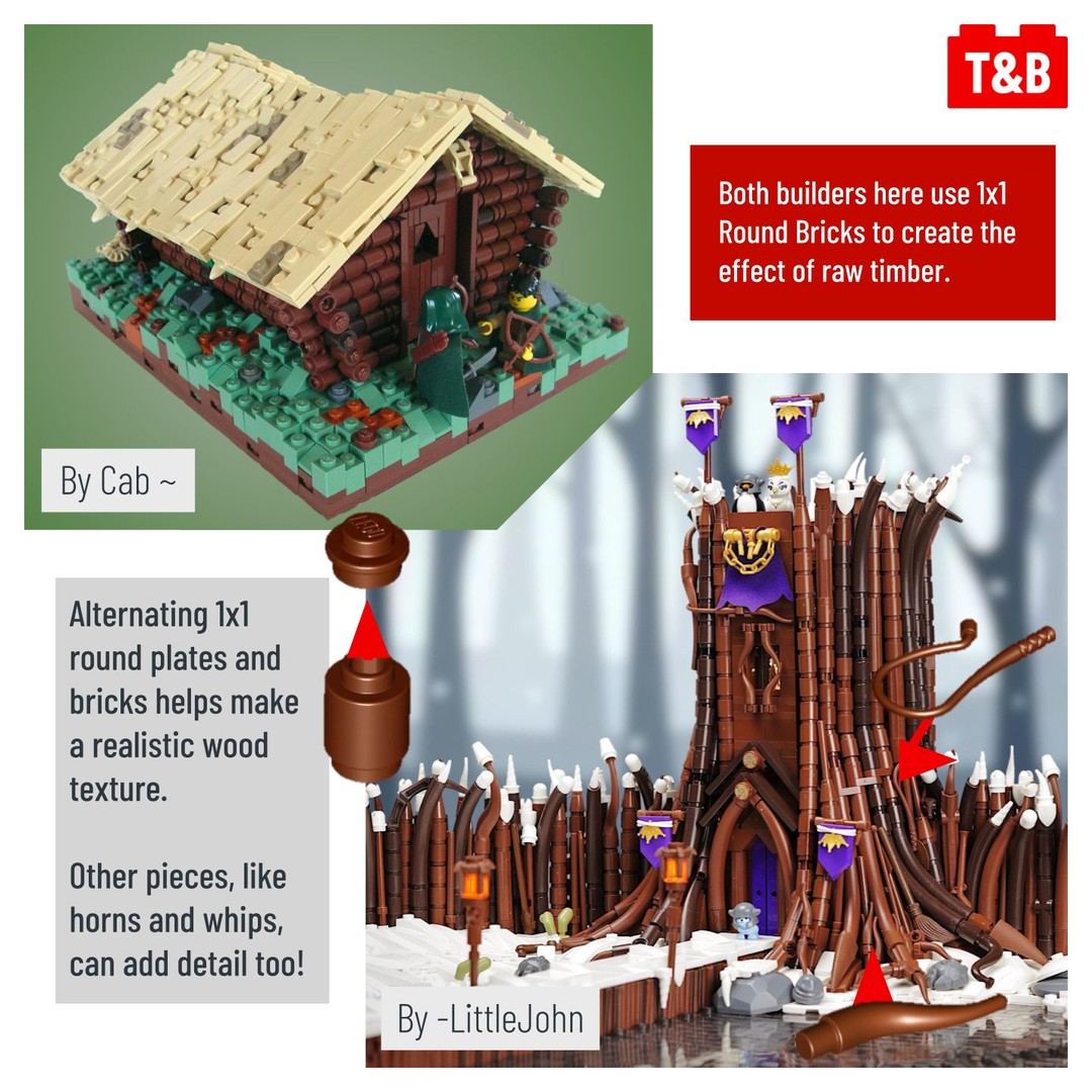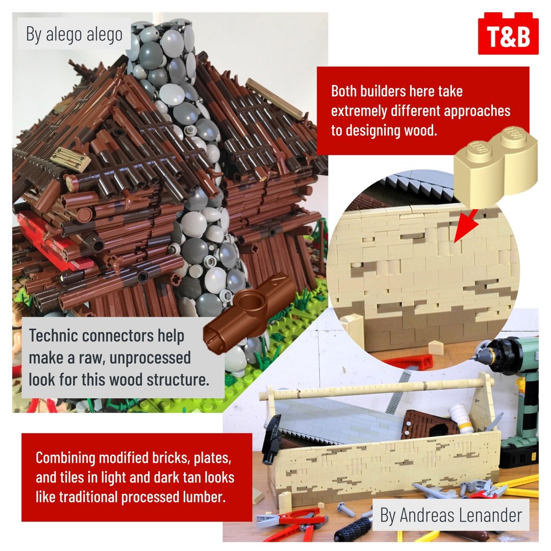 Builders go about making LEGO wood in two main ways: using plates & tiles and using round bricks & plates. Whether on its side with SNOT or stacked vertically, the simplest parts can make for extremely detailed wood designs.
