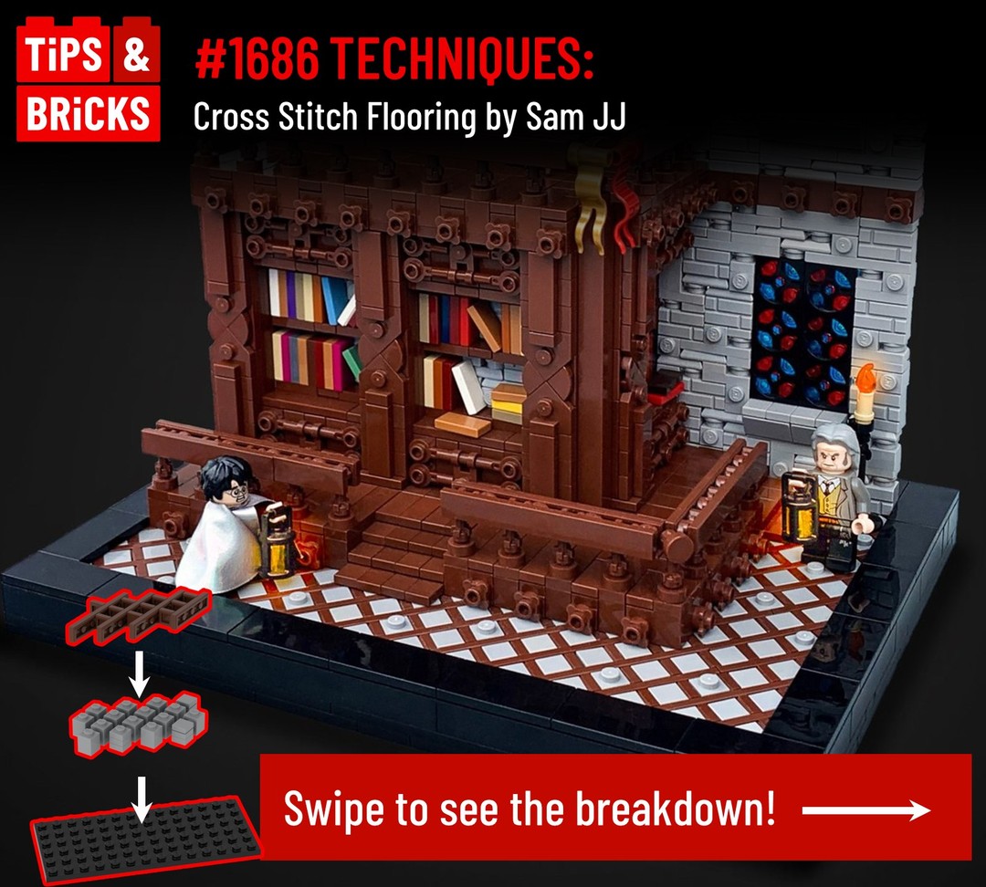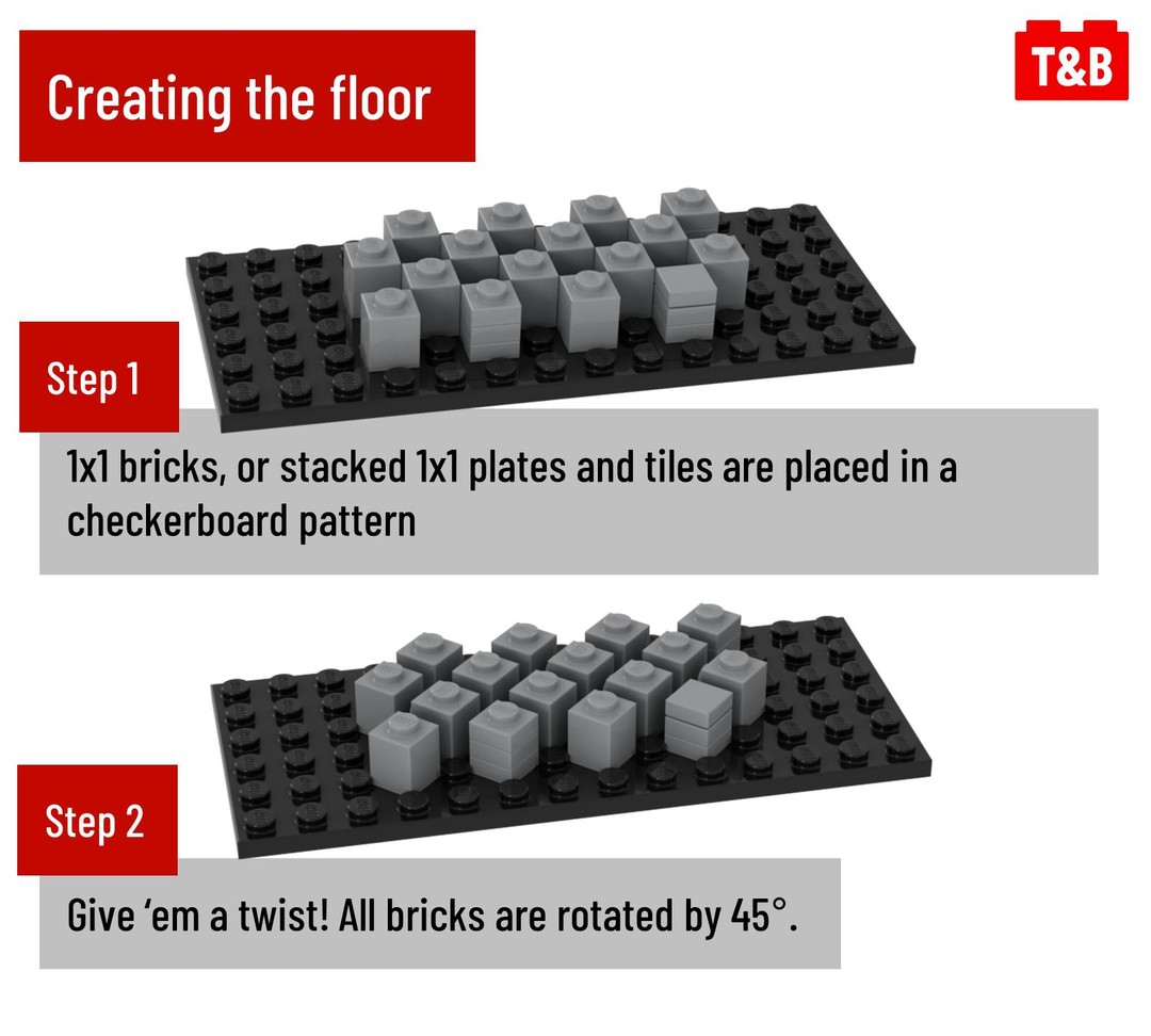 Step lightly upon this wonderful floor which uses a quirk (or should we say… a twist?) in LEGO geometry to achieve a cross-stitch effect. The technique is easier than you think!