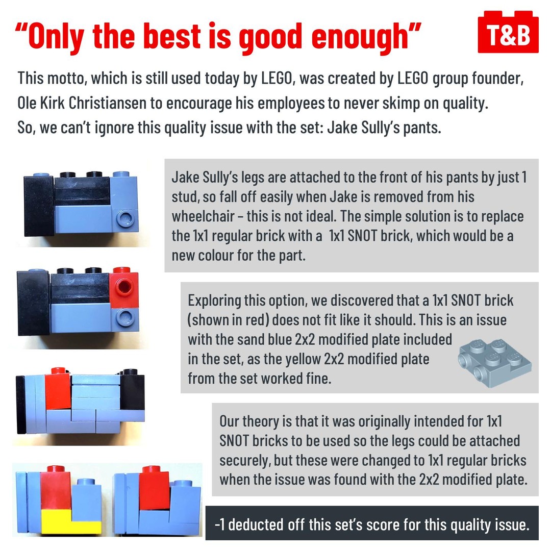 The set impressed us in a wide range of areas, from the printed parts and abundance of SNOT parts to the fantastic wheelchair design and accuracy of the characters. However, we did find one quality issue with the bricks that was disappointing, and the set lacks hair designs that usually make BrickHeadz interesting – a missed opportunity for the Avatar’s hair.