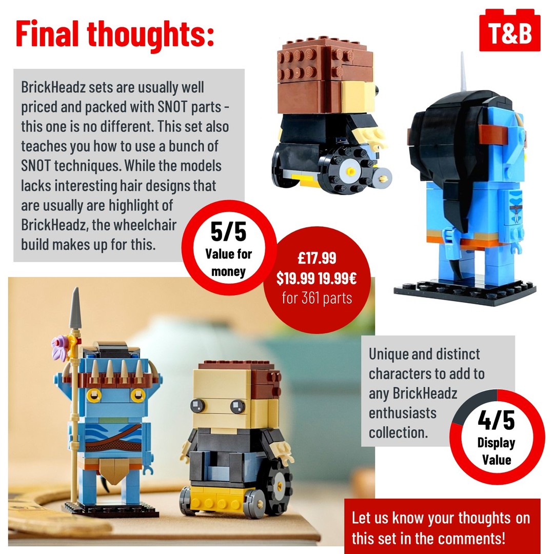 Today we’re reviewing a BrickHeadz set, an affordable and collectable addition to anyone’s collection. These new BrickHeadz, numbered 180 and 181, are Jake Sully & his Avatar from the film Avatar, which is getting a sequel later this year. Notably, this BrickHeadz is the first with a wheelchair and articulated limbs, which D&I supporters like us will appreciate.