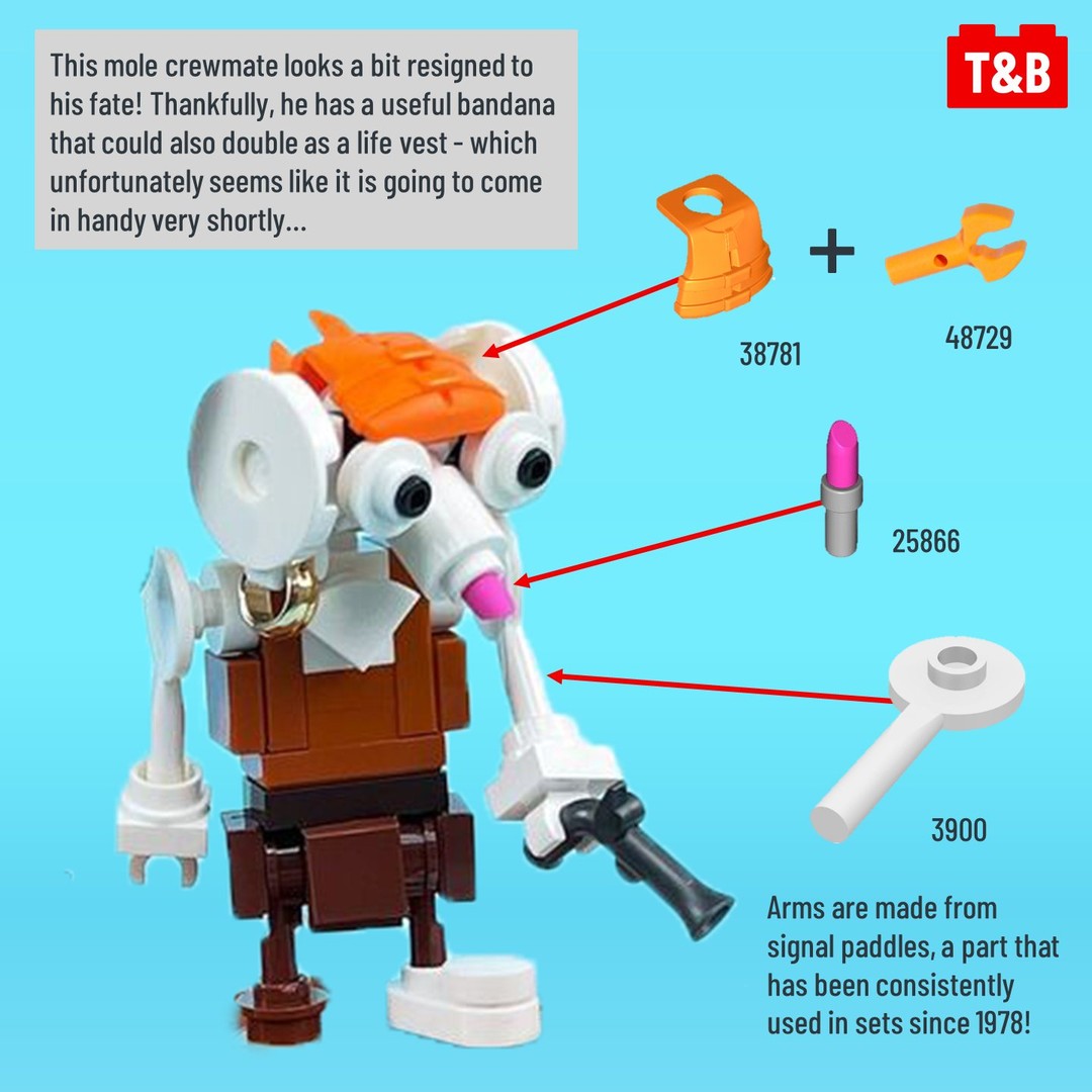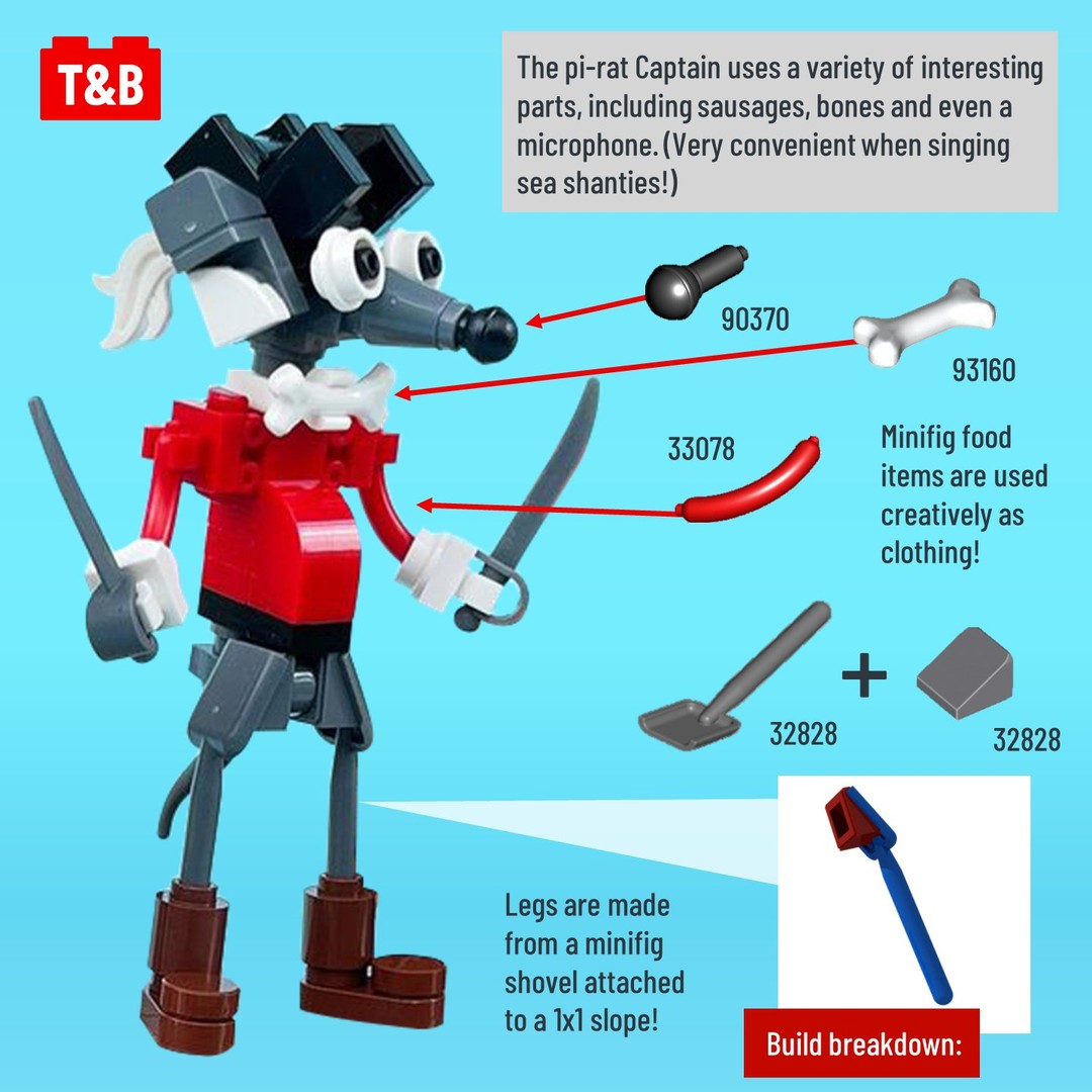 The expressive pirate characters in this build are an excellent example of how to use parts in unconventional ways, most notably minifigure accessories including cherries, sausages, bones, shovels and even a life jacket!