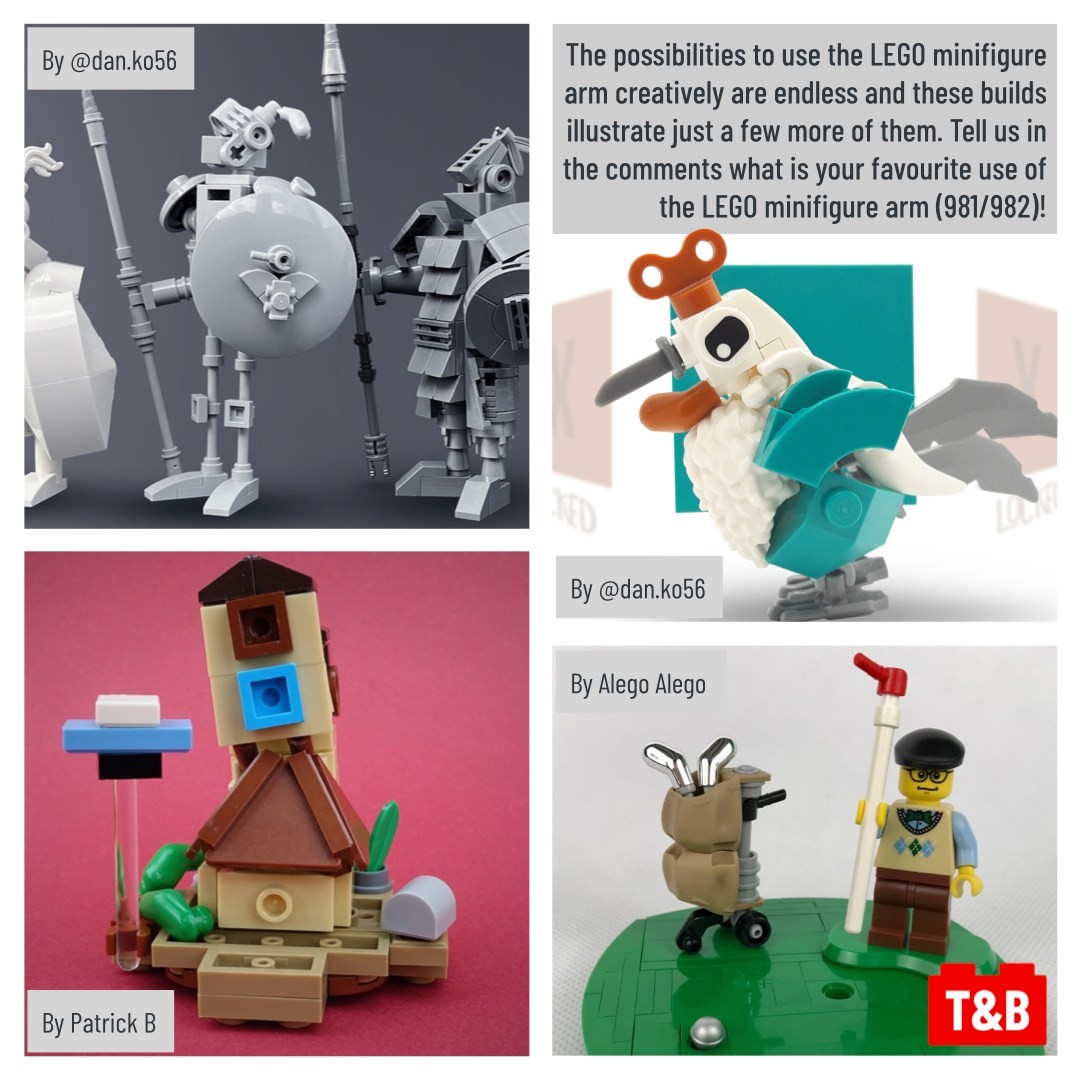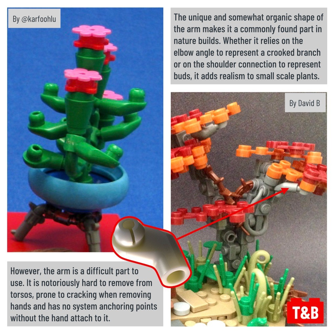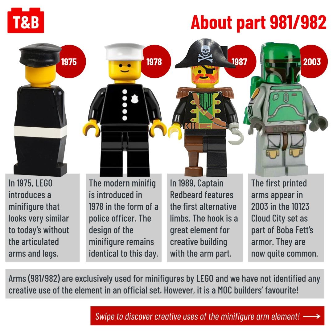 The minifigure arm part, or parts since there is a left (981) and a right (982) arm, is absolutely unique. Available in nearly 70 colors and numerous prints, it features no system anchoring points and a very irregular shape and angle. It makes it a challenging, yet appealing, part to use creatively!