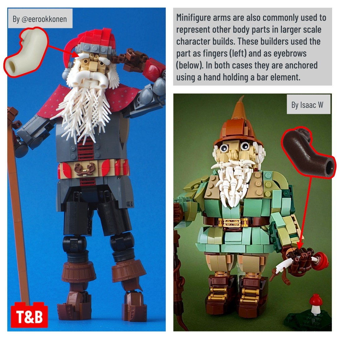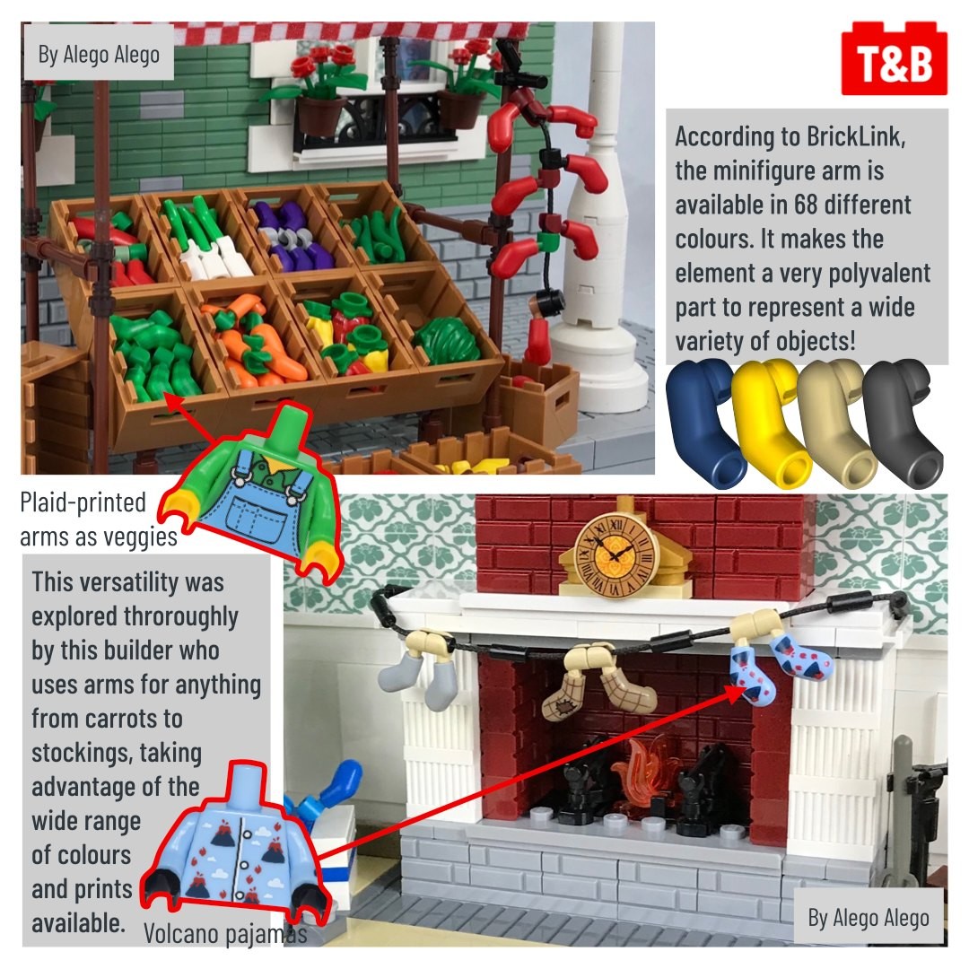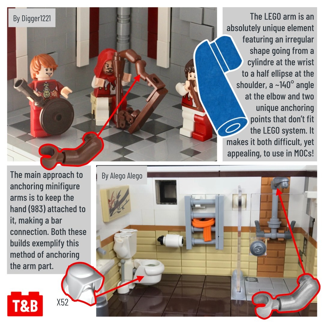 The minifigure arm part, or parts since there is a left (981) and a right (982) arm, is absolutely unique. Available in nearly 70 colors and numerous prints, it features no system anchoring points and a very irregular shape and angle. It makes it a challenging, yet appealing, part to use creatively!