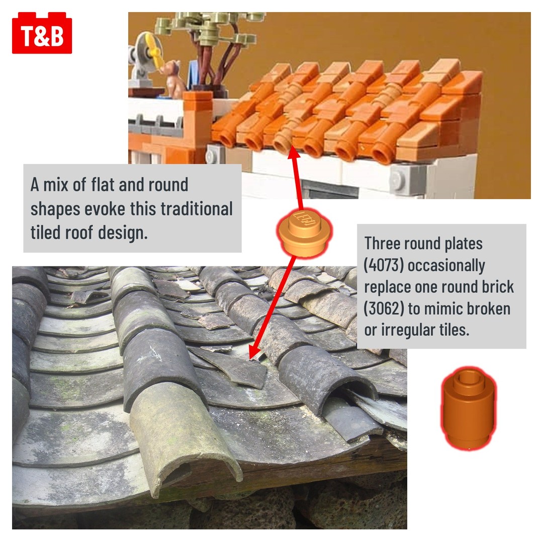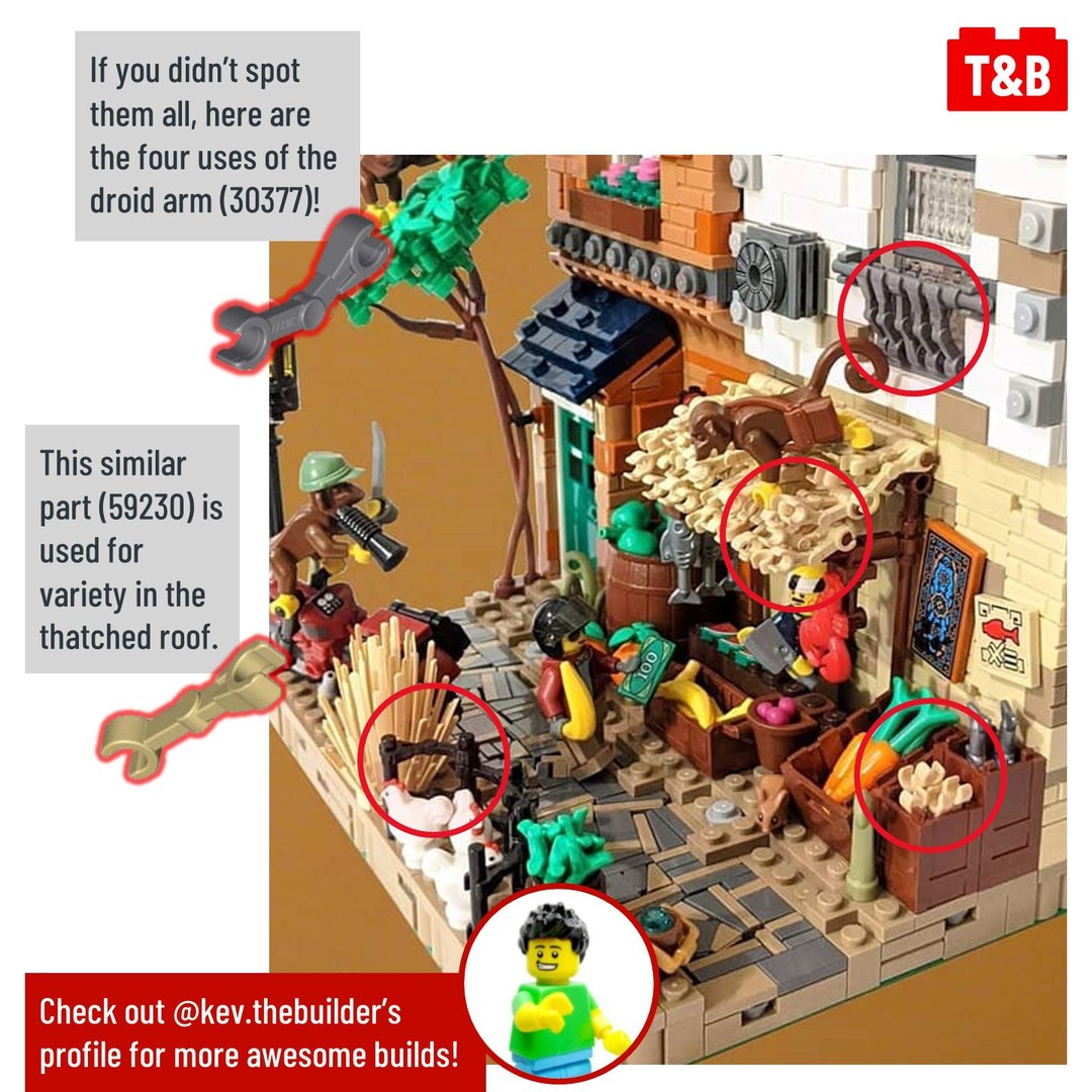 To complete the setting, ordinary parts are assembled in creative ways to mimic real-world building techniques. The same parts are used in multiple ways throughout. And multiple connection points on the same part are used to great effect.