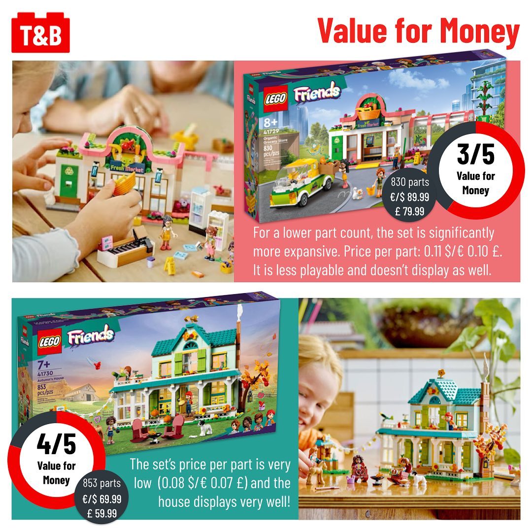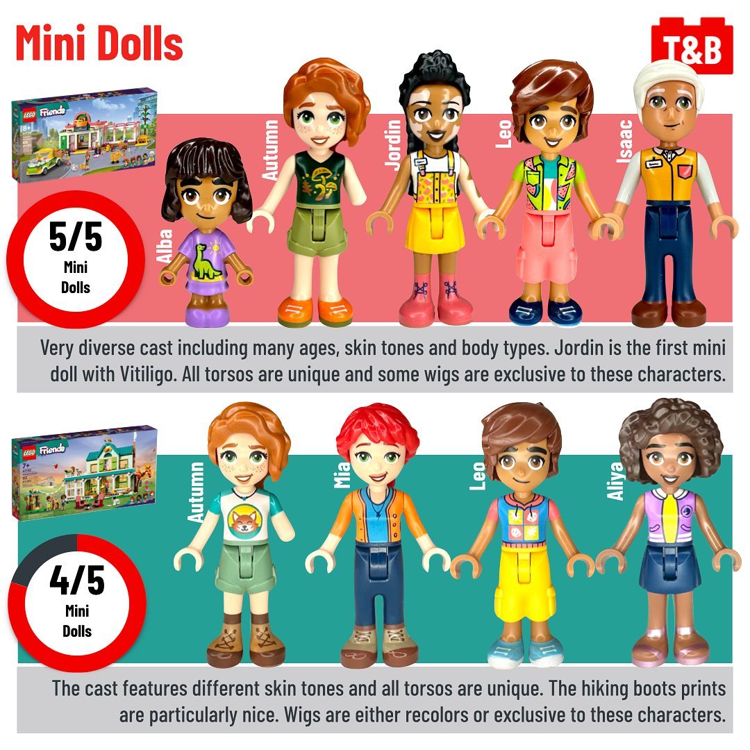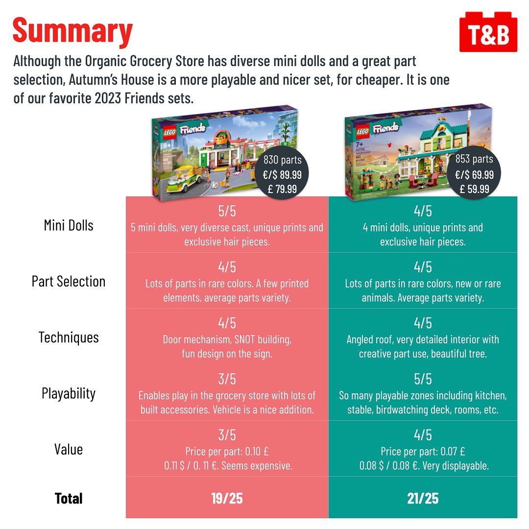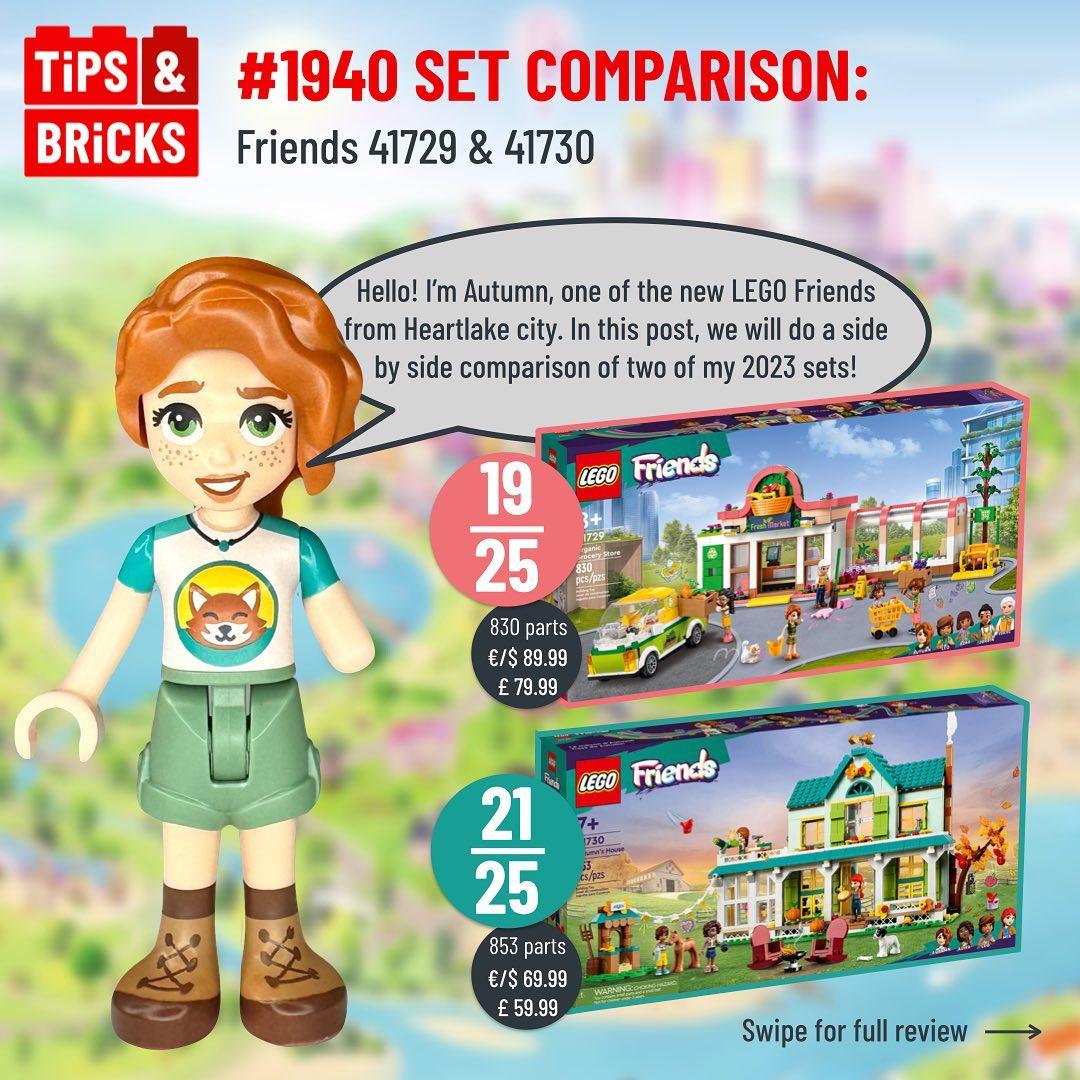 Autumn, one of the new 2023 LEGO Friends, appears in two similar size sets: 41729: Organic Grocery Store (€/$ 89.99 – £ 79.99 for 830 parts) and 41730: Autumn’s House (€/$ 69.99 – £ 59.99 for 853 parts). In this post, follow her on a comparison of these two sets’ mini dolls, part selection, techniques, playability, and value for money.