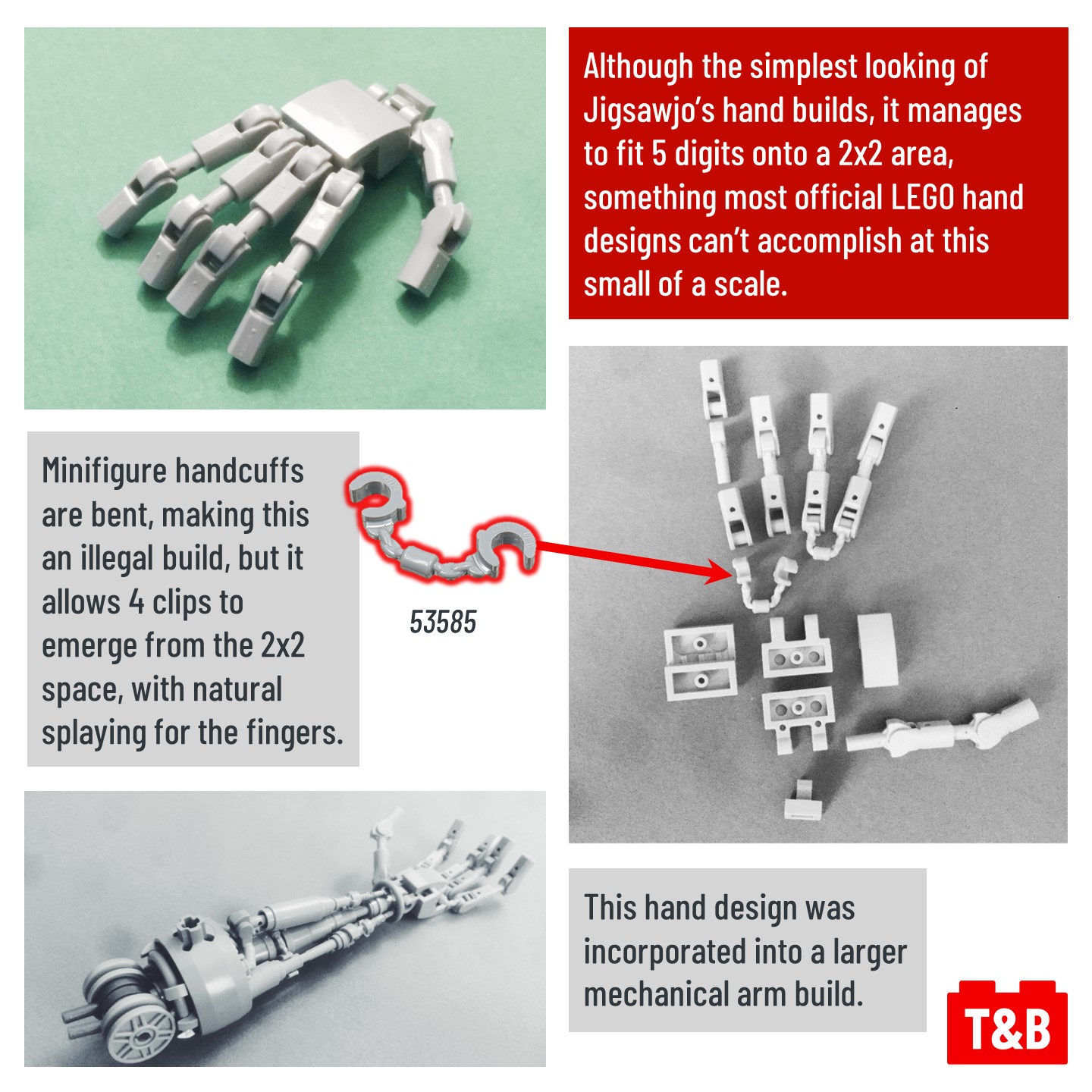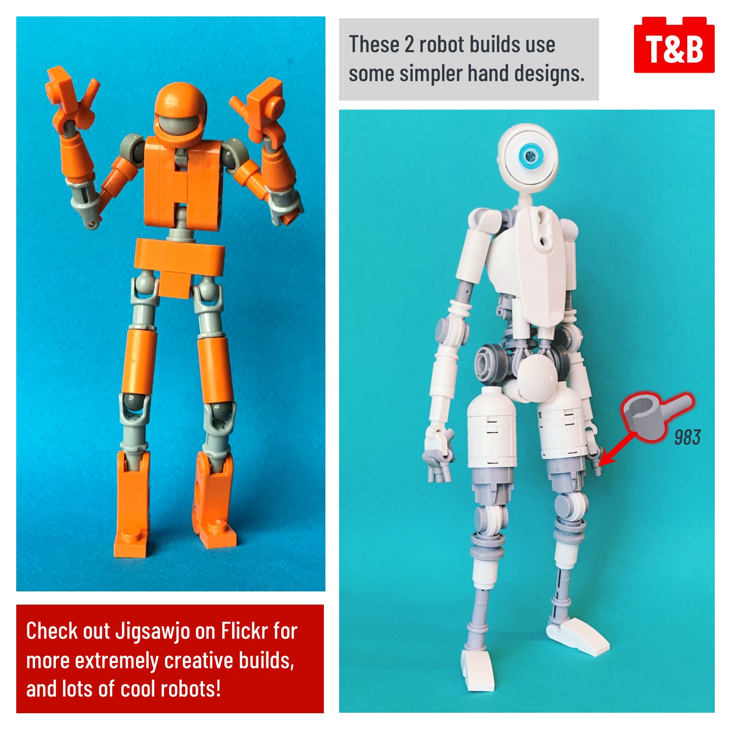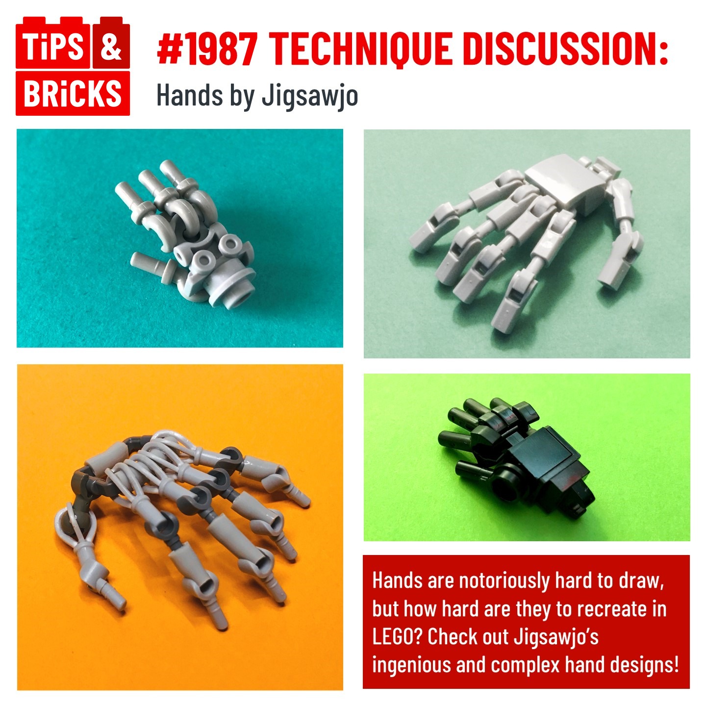 In todays technique discussion, check out these incredibly complex hand designs by Jigsawjo over on Flickr! These hand builds make use of some super unique parts and connections to create the different features of hands! Make sure to check out Jigsawjo on Flickr for more awesome builds!