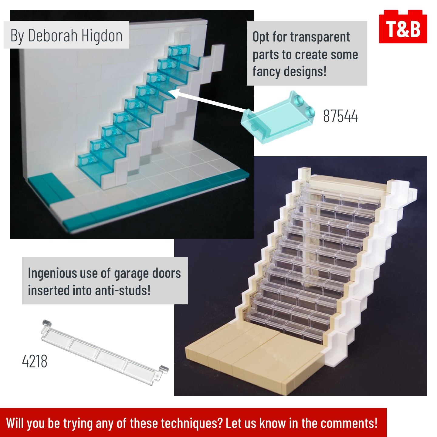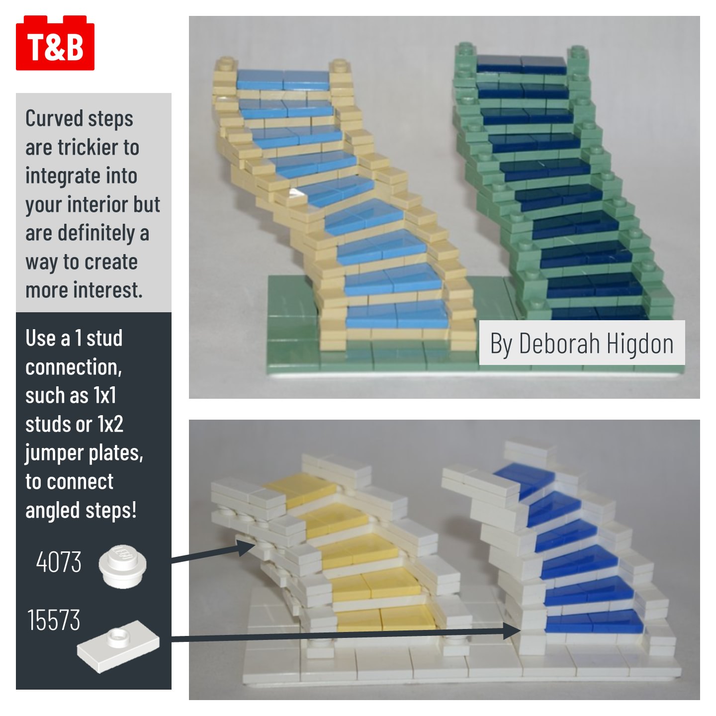 Don’t just stack bricks to create stairs – your minifigures deserve better than that! Discover ways to upgrade your designs in today’s post, featuring designs by Deborah Higdon (@buildings_blockd), soccerkid6 (@isaacsnyder_brickbuilt) and SEBASTIAN-Z on Flickr.