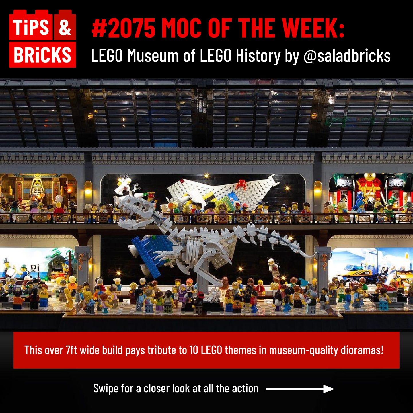 Luis Saladrigas AKA @saladbricks has created a truly astounding MOC and theme tribute. While our last MOC of the Week post featured a Museum of Fine Art, @saladbricks is inspired by the Museum of Natural History. This massive build features displays that showcase condensed dioramas of some of our favorite LEGO themes, plus fun scenes with civilians that bring the entire build to life!